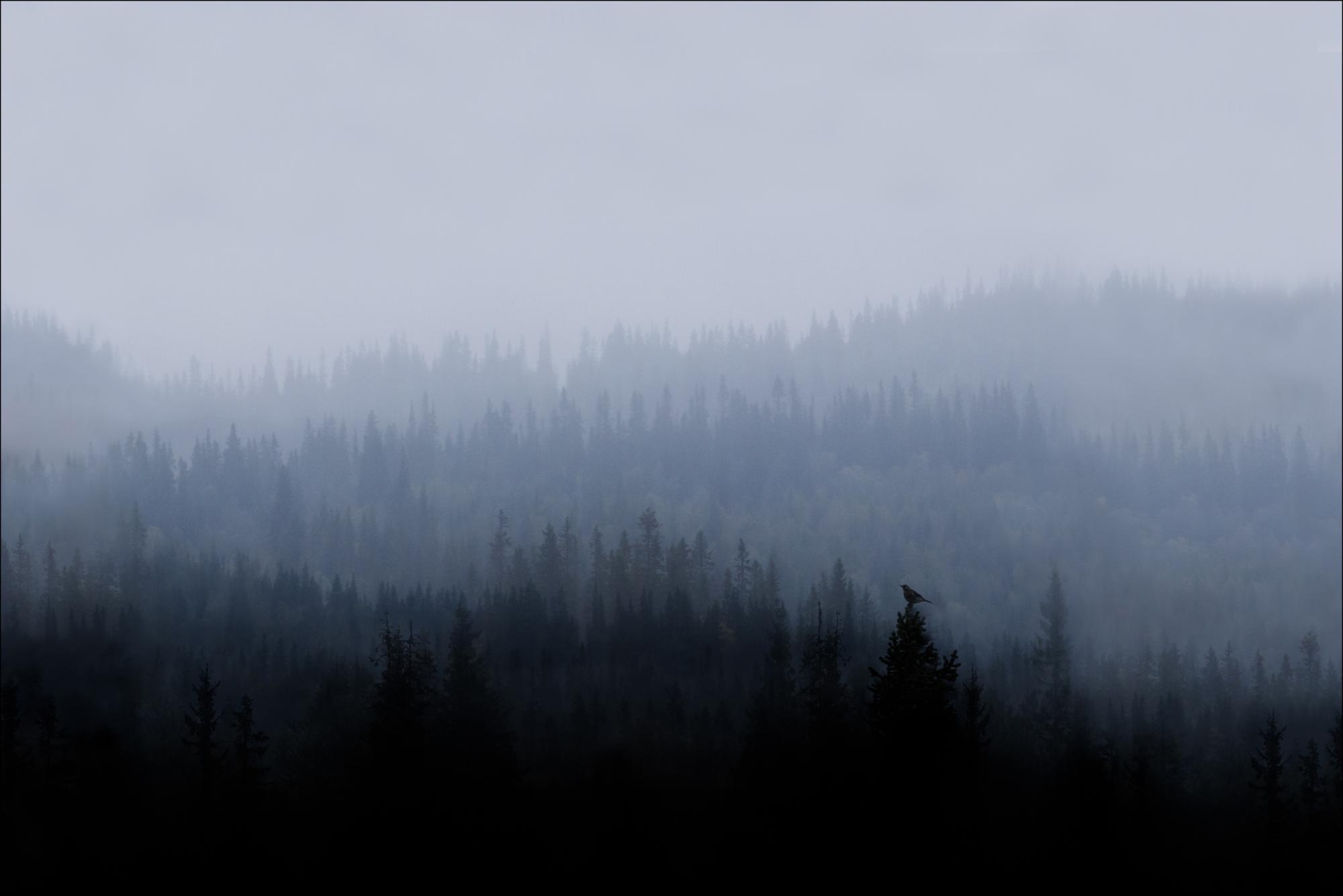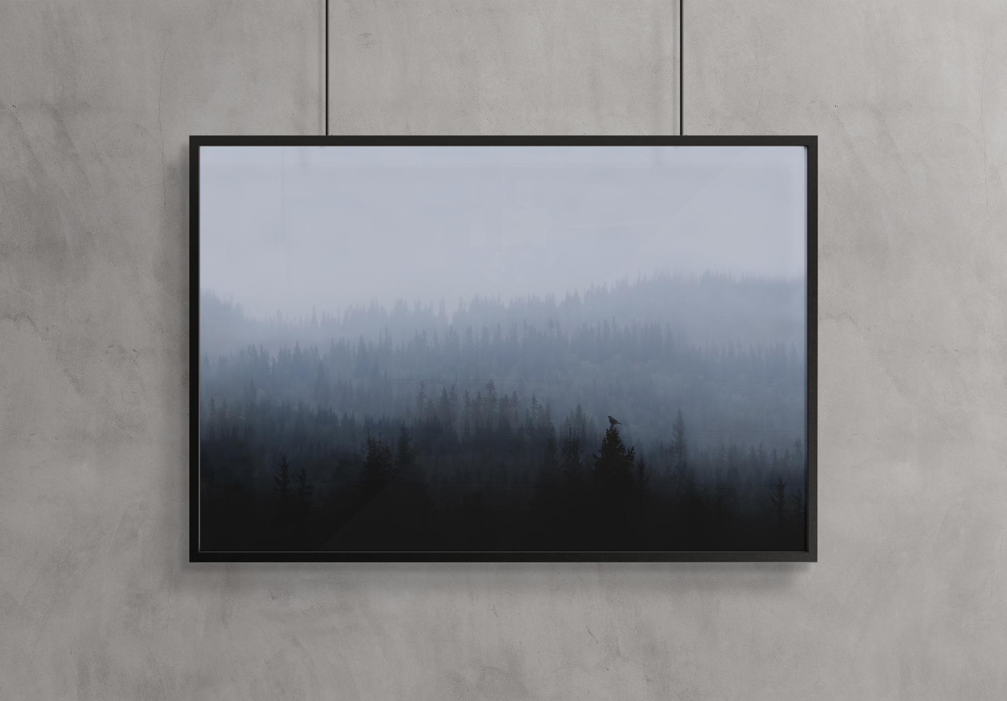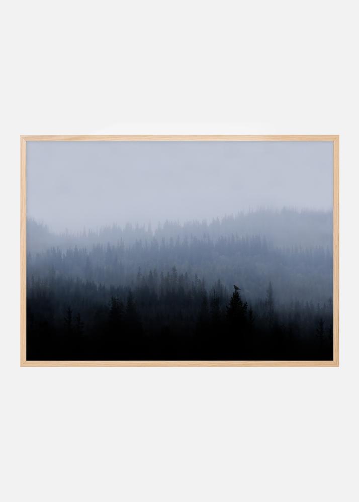 Plagát s chladným ránom na hmlistom lesnom svahu. Ranný vták sedí na vrchole stromu v popredí, zatiaľ čo svetlo je vidieť na horizonte v kopcovitom pozadí. Čiernobiely obraz dodáva zimnú atmosféru vášmu domovu.