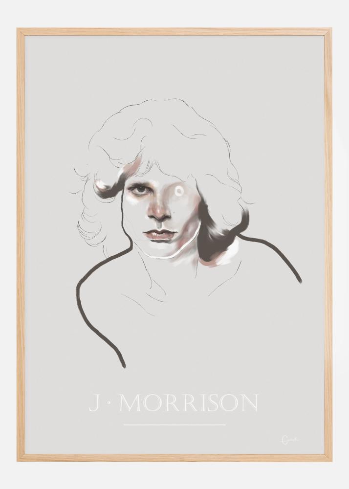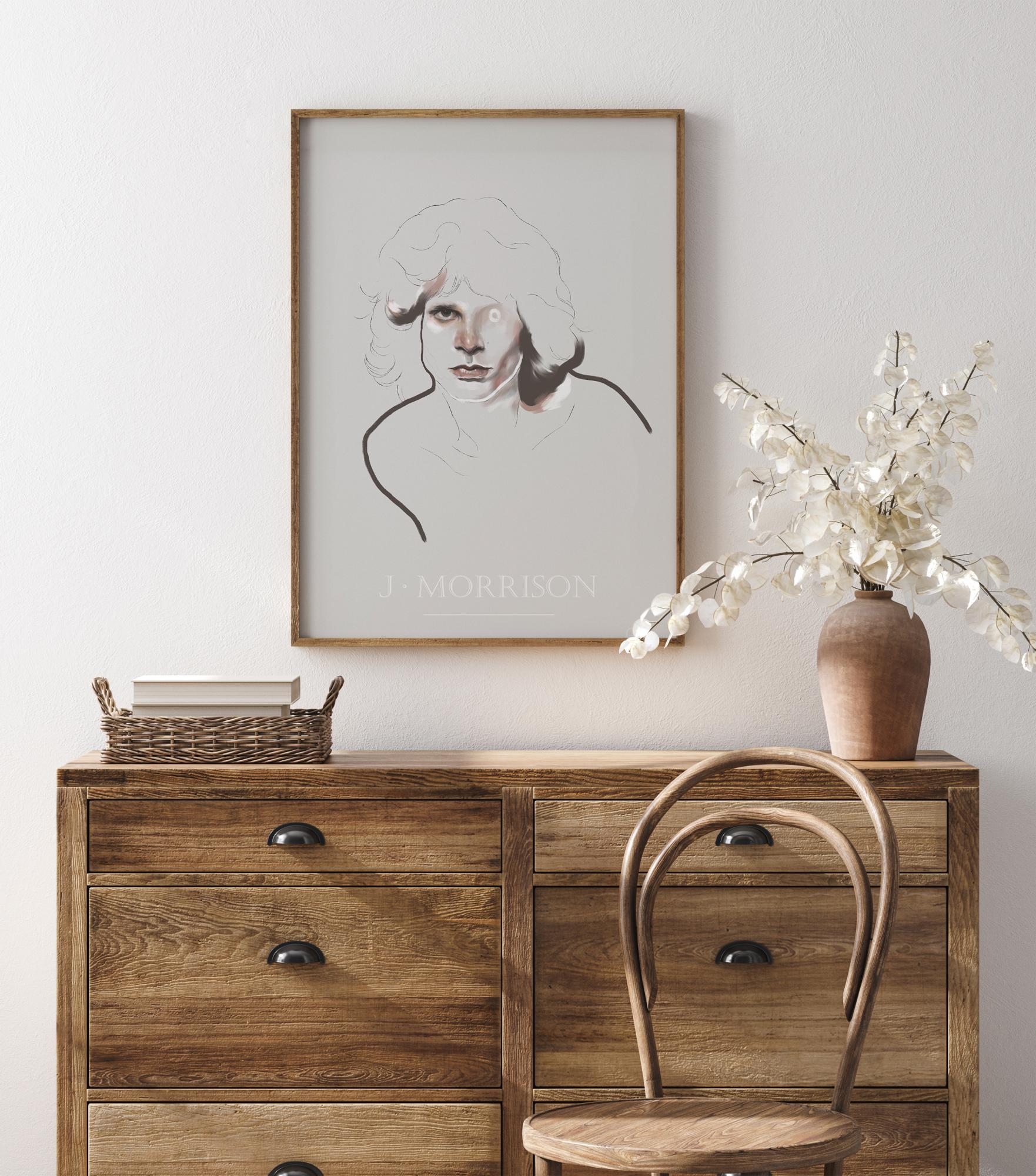 Krásny plagát s Jimom Morrisonom. Na béžovom pozadí je hlava a ramená umelca nakreslené čiernym perom, zatiaľ čo ústa sú kontúrované hnedou farbou. Ľavé oko je bez očného viečka. Perfektná tlač pre všetkých, ktorí milujú hudbu.