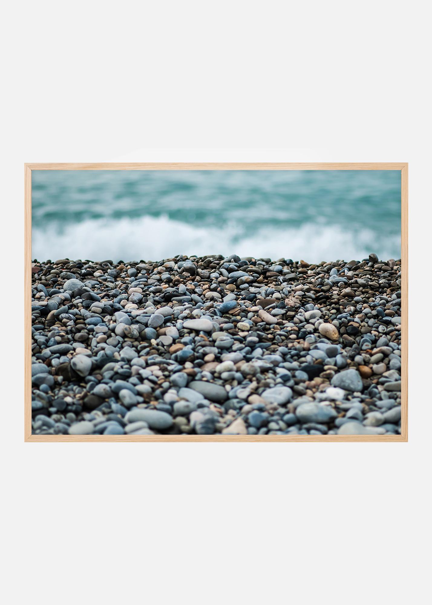 Počujte šum morských vĺn z tohto plagátu s krásnou kamienkovou plážou v popredí. Krátka hĺbka ostrosti vytvára zaujímavý obraz, ktorý priťahuje oči do obrazu. Nájdete medzi kameňmi nejaký obitý kus skla? Šedo-modrá farebná škála sa dobre hodí s úzkym rámom na svetlej stene, ideálne s námornými doplnkami.