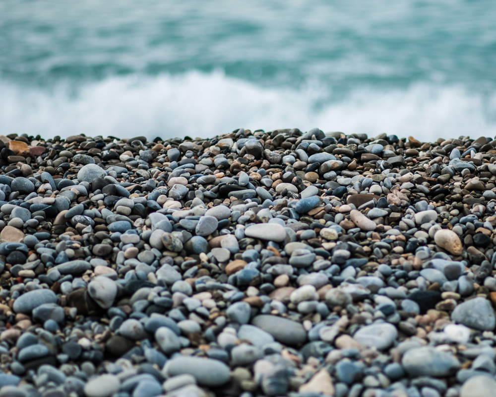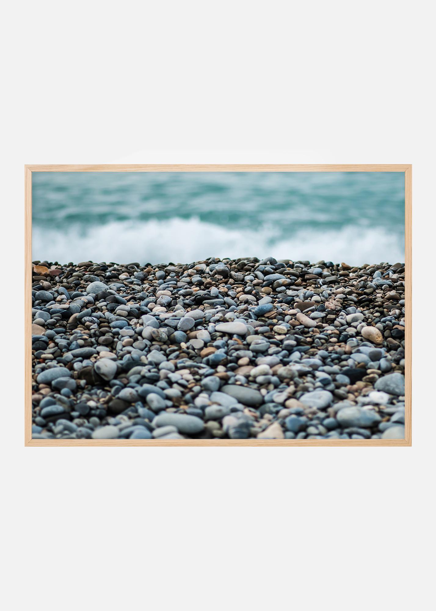 Počuť šumenie morských vĺn z tohto plagátu s krásnou kamennou plážou v popredí. Krátka hĺbka ostrosti vytvára zaujímavý obraz, ktorý priťahuje oči do obrázka. Nájdete medzi kameňmi nejaký okrúhliak? Šedá a modrá farebná škála sa dobre hodí s úzkym rámom proti svetlej stene, ideálne s námornými doplnkami.
