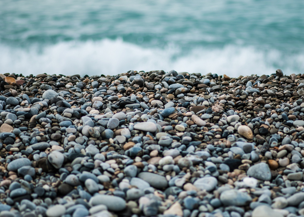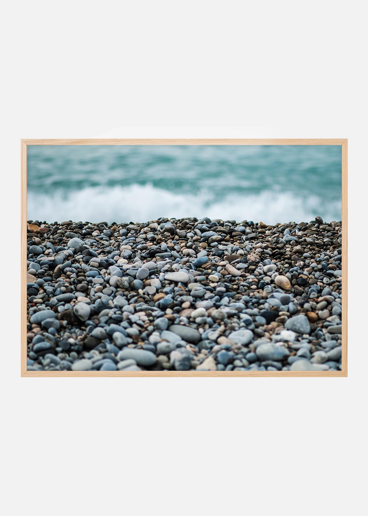 Počujte zvuk morských vĺn z tohto plagátu s krásnou kamennou plážou v popredí. Krátka hĺbka ostrosti vytvára zaujímavý obraz, ktorý pritiahne oči do obrázku. Nájdete nejaký zaoblený sklenený kúsok medzi kameňmi? Šedo-modrá farebná škála sa dobre hodí s úzkym rámom na svetlej stene, ideálne s morskými doplnkami.