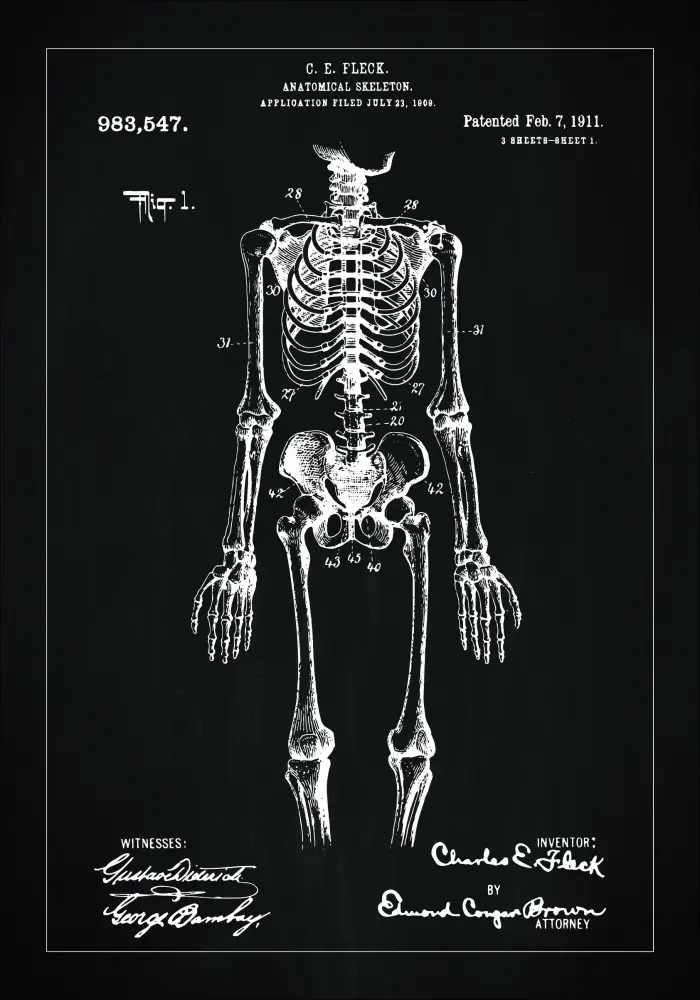 Tento fascinujúci patentový plagát zobrazuje patent číslo 983,547, udelený C. E. Fleckovi 7. februára 1911, na anatomicky presný model kostry. Každá kosť a štruktúra je zručne vyrytá bielymi líniami proti výraznému čiernemu pozadiu, čo vytvára vizuál, ktorý je zároveň vzdelávací a umelecký. Je to spektakulárna ilustrácia, ktorá demonštruje zázraky a zložitosť ľudského tela.