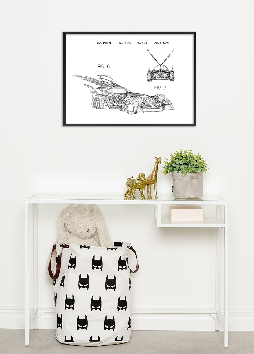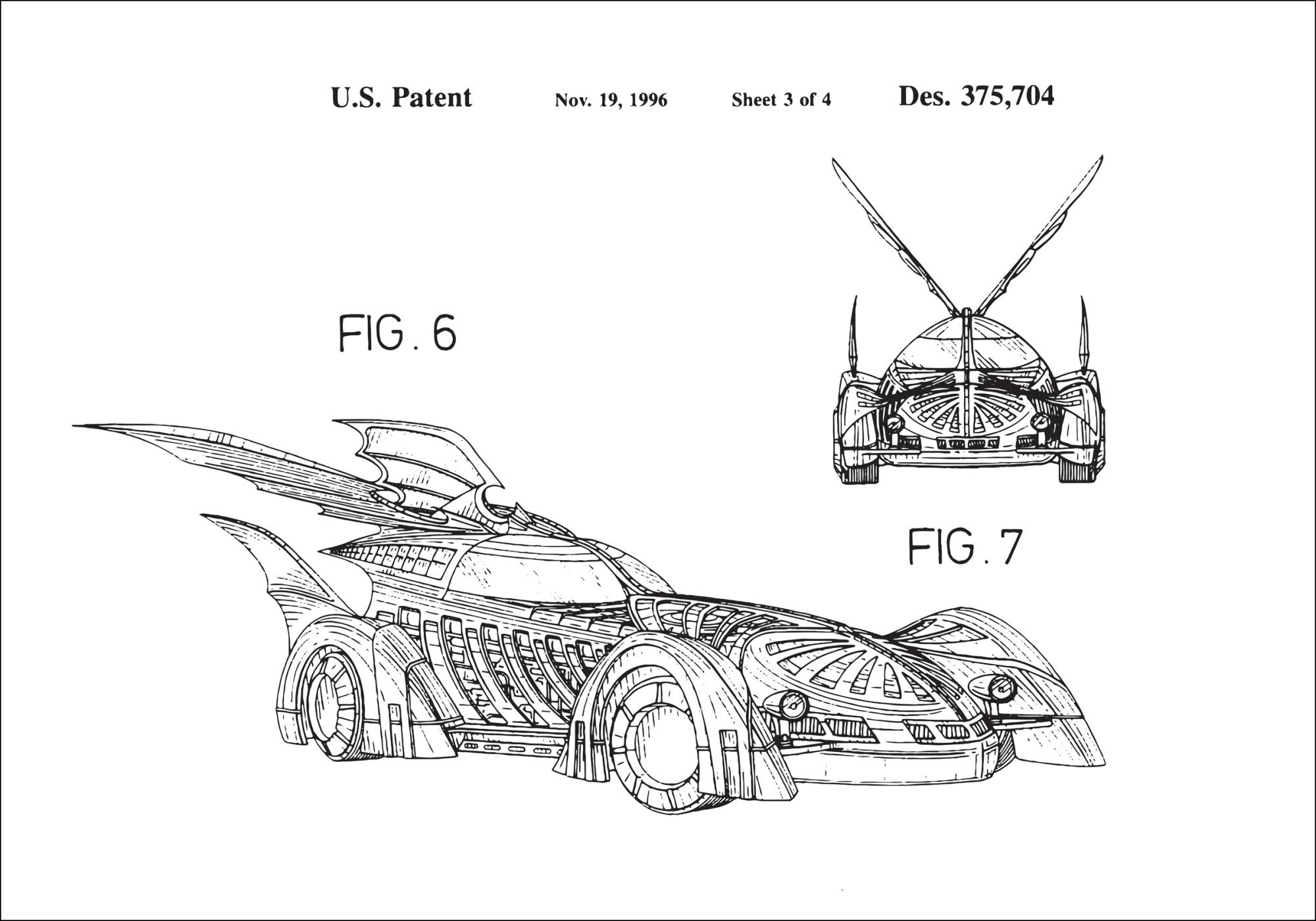 So smelým a fantáziu podnecujúcim motívom ponúka tento patentový plagát exkluzívny pohľad na proces navrhovania mimoriadneho vozidla. Zdokumentované v americkom patente Des. 375,704, vydanom 19. novembra 1996, FIG. 6 a FIG. 7 zobrazujú dva rôzne pohľady na Batmobile, ktorý sa vyznačuje aerodynamickou siluetou a dramatickým štýlom. Detaily tejto patentovej kresby, od plynulých línií po veľké zdobené krídla, robia z neho neodolateľný doplnok pre zberateľov a nadšencov dizajnu.