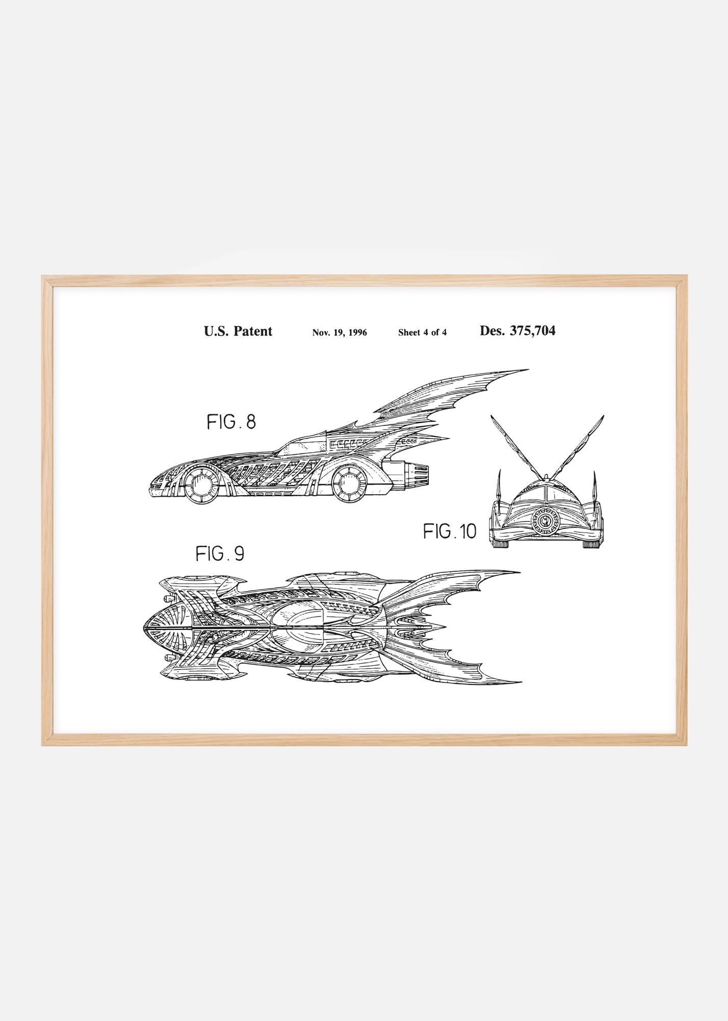 Tento patentový plagát zachytáva esenciu futuristického dizajnu a vynaliezavosti. Je súčasťou amerického patentu Des. 375,704, vydaného 19. novembra 1996. S tromi rôznymi pohľadmi na Batmanovo auto, tento patentový výkres je vyjadrením vízií budúcnosti, ktoré si dizajnér predstavil. Každá figúra odhaľuje podrobné a premyslené časti konštrukcie vozidla, od aerodynamických bočných panelov po ikonické krídla, ktoré sa tiahnu zo zadnej časti, čo ho robí ikonickým interiérovým doplnkom pre každého, kto oceňuje dizajn a inovácie.