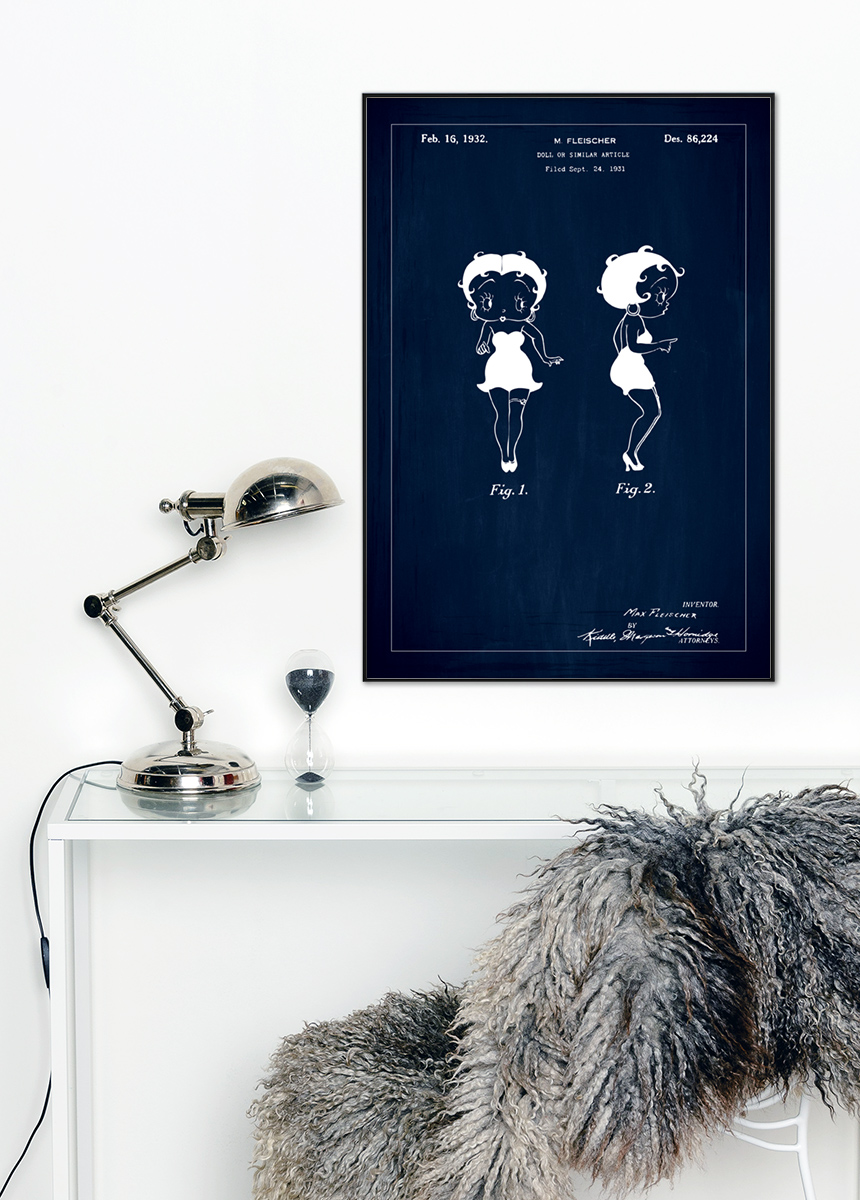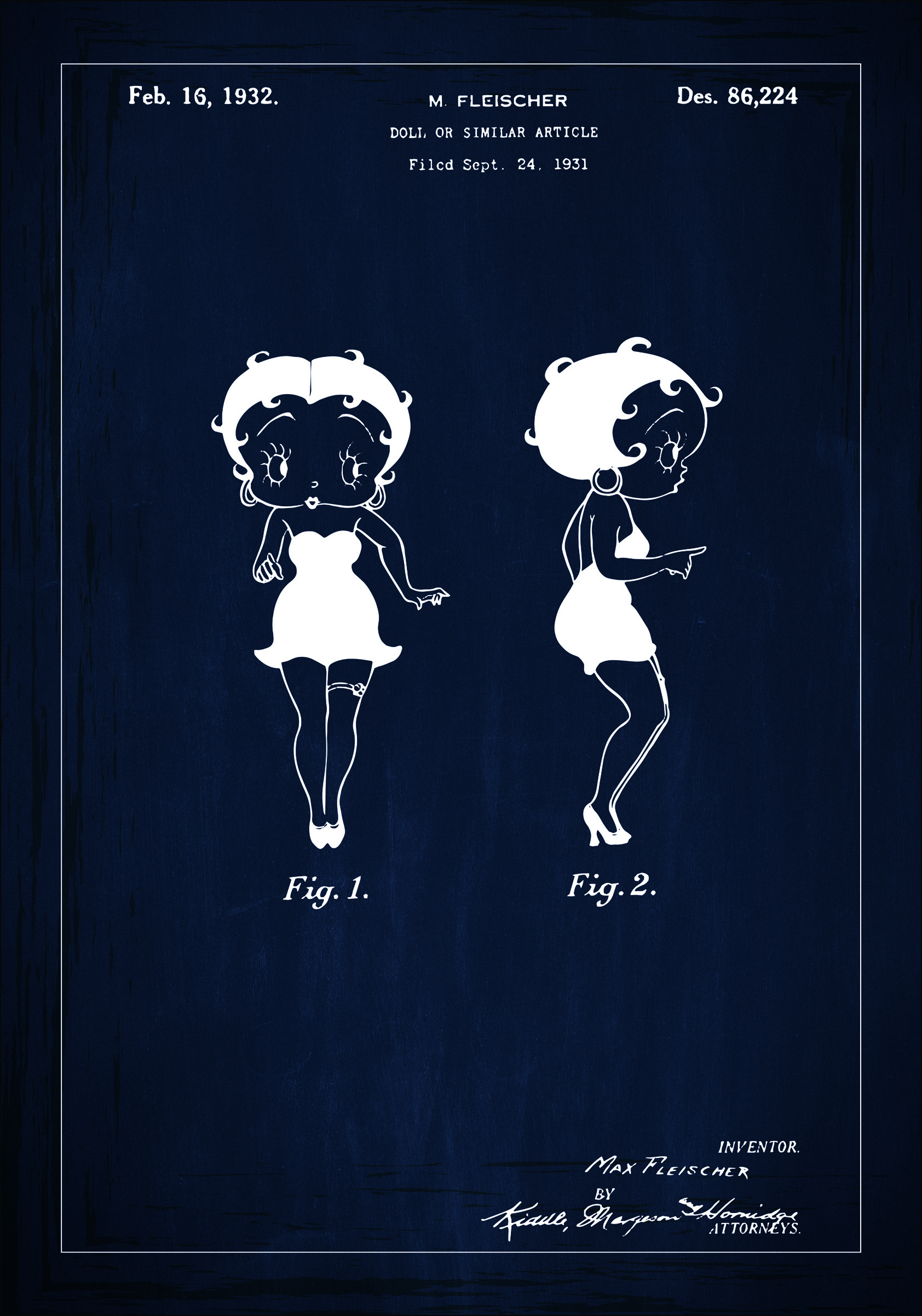 Tento patentový plakát z 16. februára 1932 zobrazuje bábiku Betty Boop, navrhnutú M. Fleischom. Číslo patentu je Des. 86,224 a žiadosť bola podaná 24. septembra 1931. Na tejto ilustrácii vidíme dve figúry bábiky; jednu spredu a jednu z boku, čo zobrazuje charakteristické vlastnosti a tvar bábiky.
