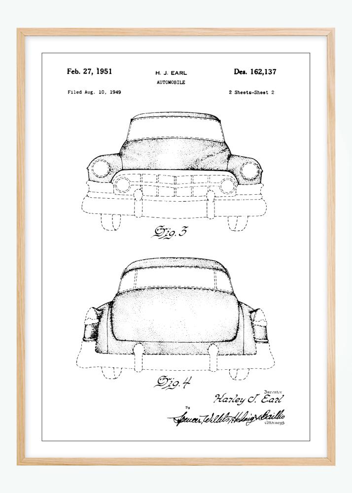 Tento štýlový patentový plagát zobrazuje ikonický Cadillac, poctu k technickým pokrokom 20. storočia. Navrhnutý H.J. Earlom a patentovaný 27. februára 1951 pod číslom Des. 162,137, tento patentový výkres je nevyhnutnosťou pre všetkých, ktorí ocenia estetiku klasického auta a jeho dizajnovú históriu. Plagát zobrazuje vozidlo v profile z prednej a zadnej strany a bohatá detailnosť ilustrácií vyvoláva pocit nostalgie a obdivu.