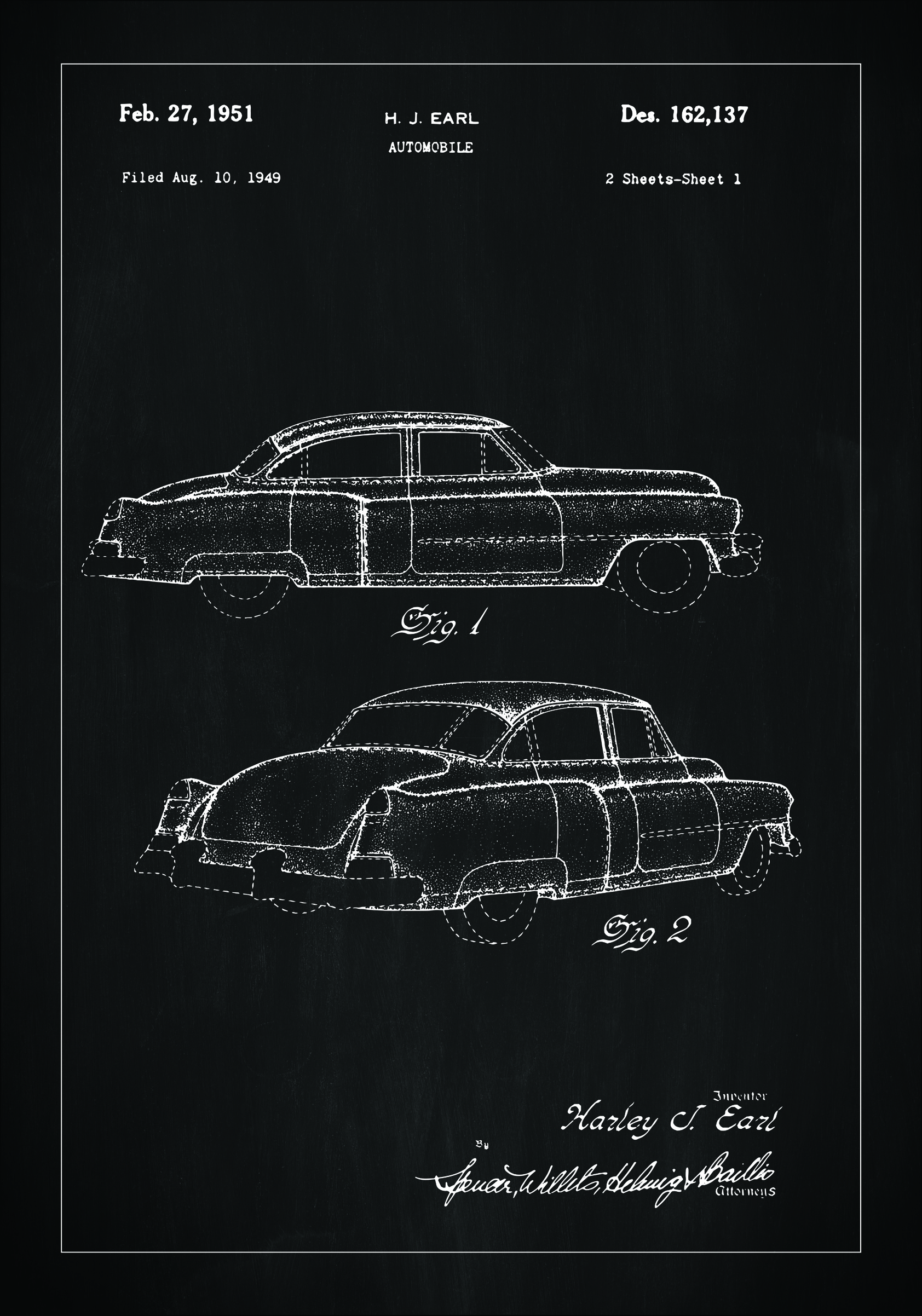 Tento patentový plagát predstavuje elegantný obraz Cadillacu, patentovaného dňa 27. februára 1951 H.J. Earlom pod patentovým číslom Des. 162,137. Detaily tohto výkresu, podaného dňa 10. augusta 1949, zachytávajú dynamické tvary a inovatívny dizajn, ktoré sa stali charakteristickými pre tú dobu automobilového priemyslu. Pohľad z boku a trojrozmerný uhol poskytujú jedinečný pohľad na proporcie a dizajn karosérie, čo ukazuje na štýl a krásu, ktorá bola výrazná počas 50. rokov.
