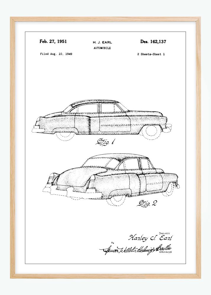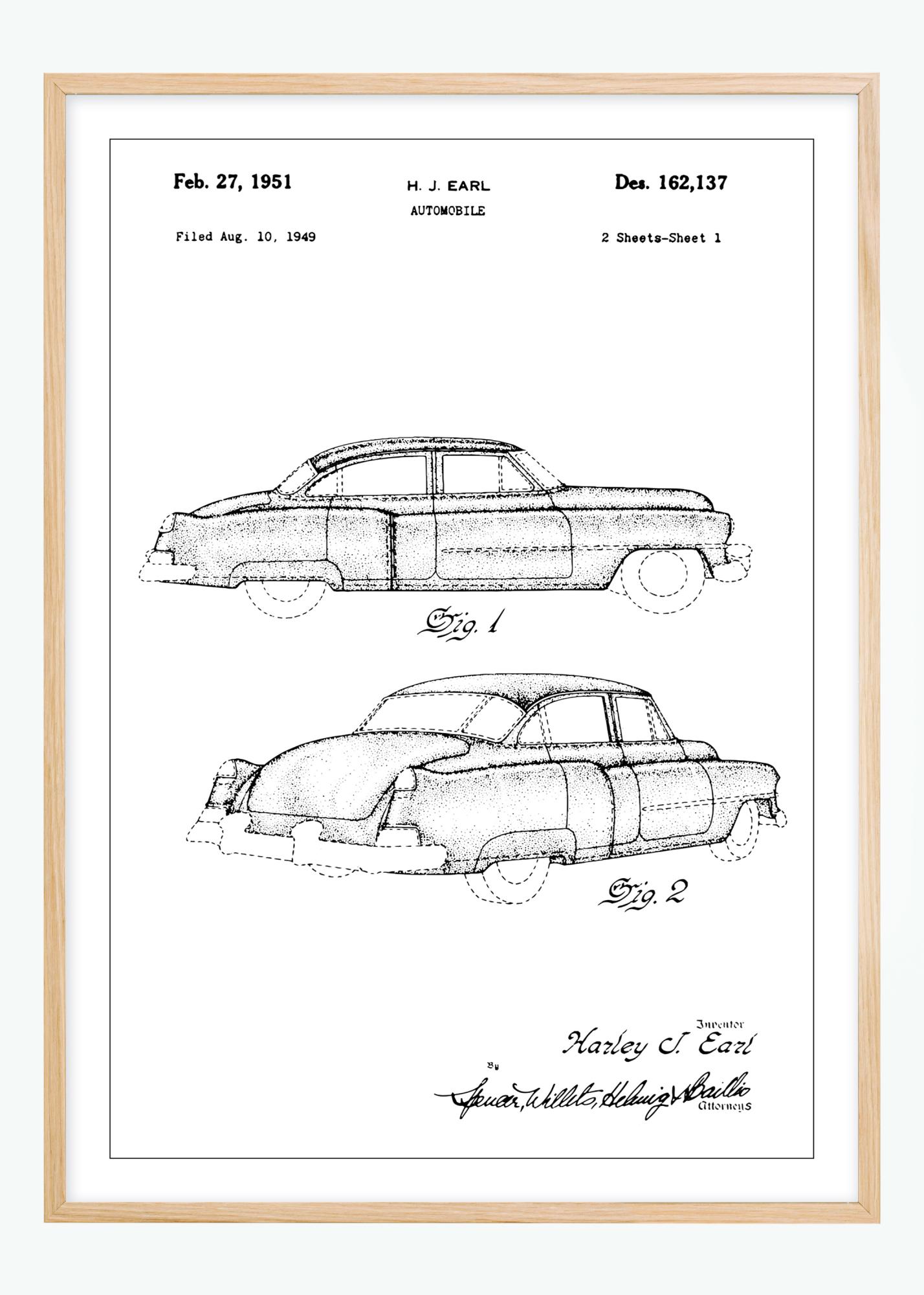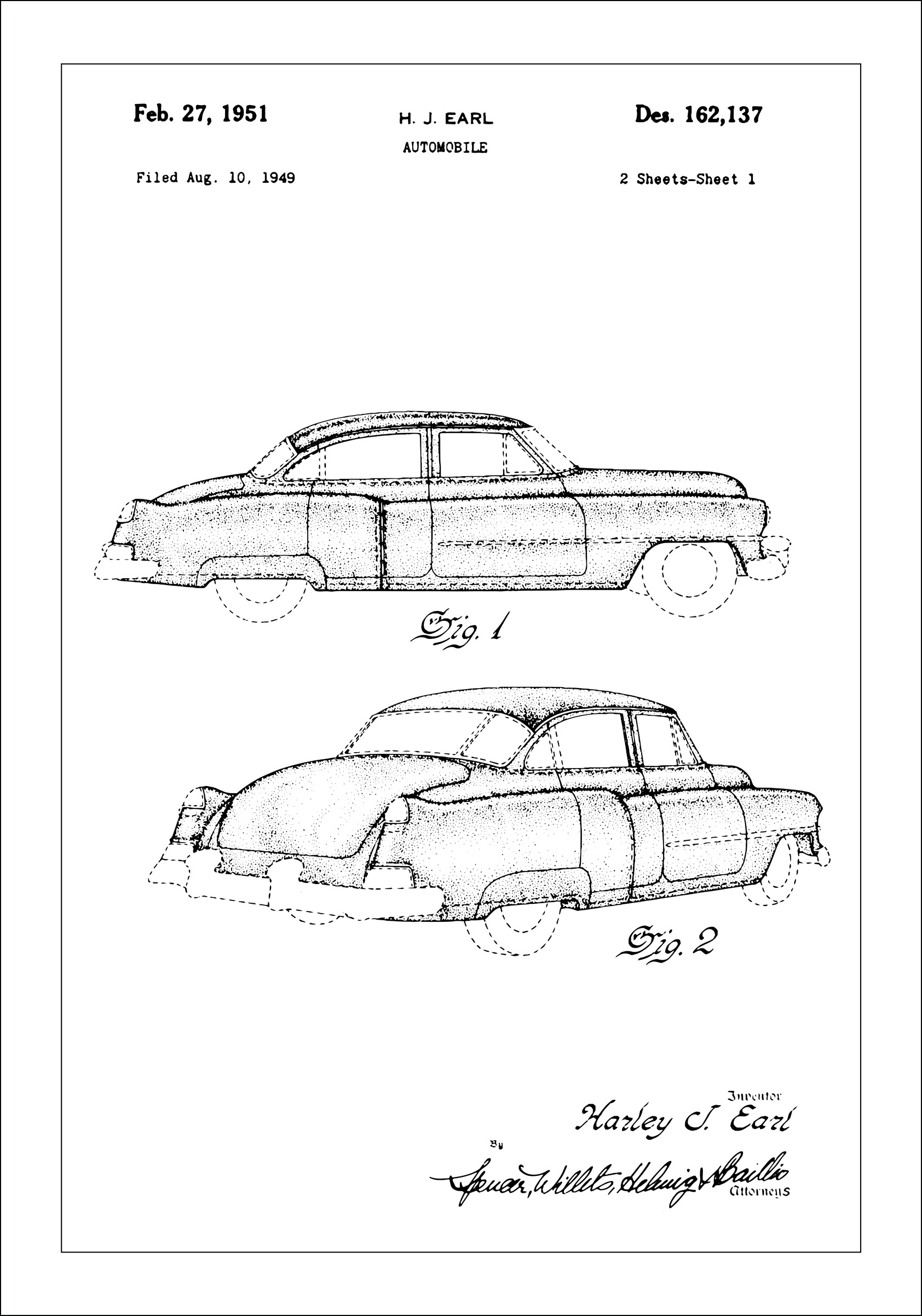 Tento patentový poster predstavuje sofistikovaný výkres auta na Cadillacu, navrhnutý slávnym H.J. Earlom. Dátum 27. február 1951, s patentovým číslom Des. 162,137, pôvodne podaným 10. augusta 1949, zachytáva tento obraz podstatu povojnovej automobilovej výroby. Motív je poctou zlatému veku amerického auta a je vyrobený s dôrazom na detaily, ktoré zaujímajú nielen výrobcov áut, ale aj milovníkov dizajnu.