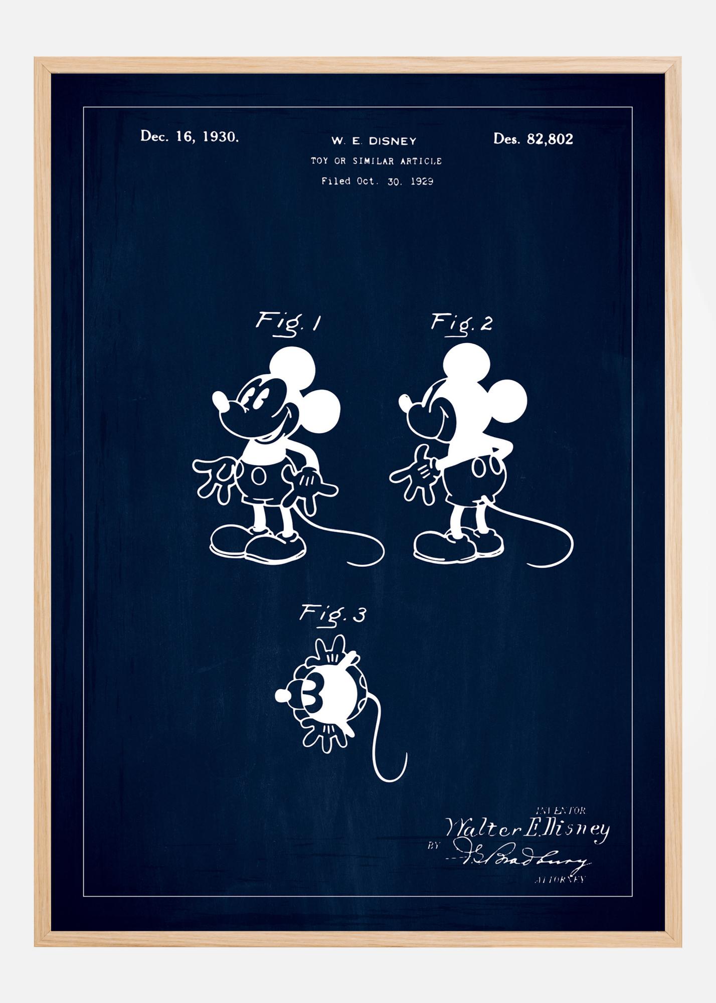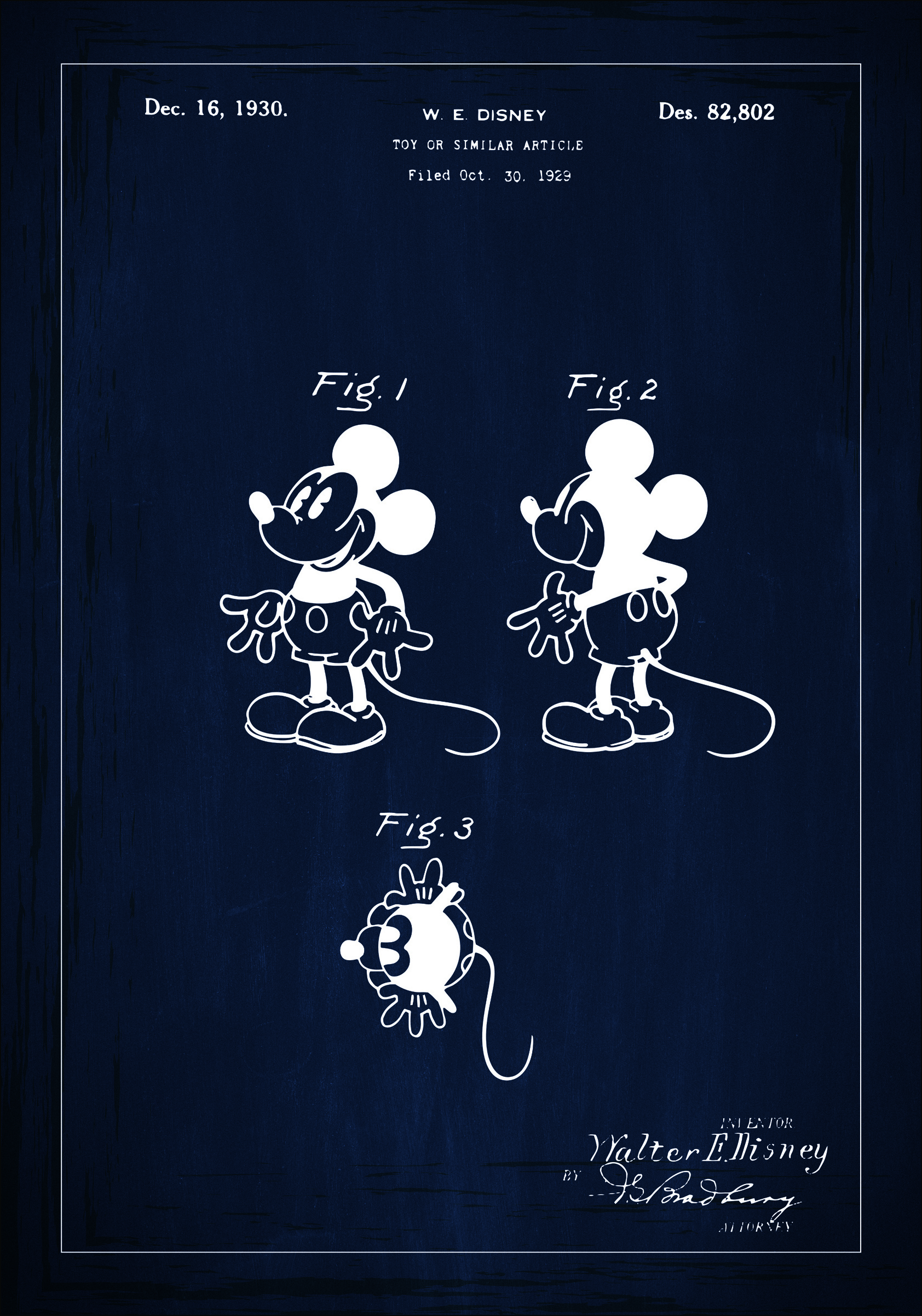 Tento patentový plagát zdôrazňuje nadčasový dizajnový klasik zdokumentovaný v patente Des. 82,802 vydanom 16. decembra 1930 W.E. Disneym. Motív zahŕňa tri postavy myšiaka Mickeyho, ktoré ukazujú rôzne uhly a detaily dizajnu: postava spredu, profil a detail ruky, všetky očíslované na ilustráciu špecifických vlastností tohto ikonického dizajnu.