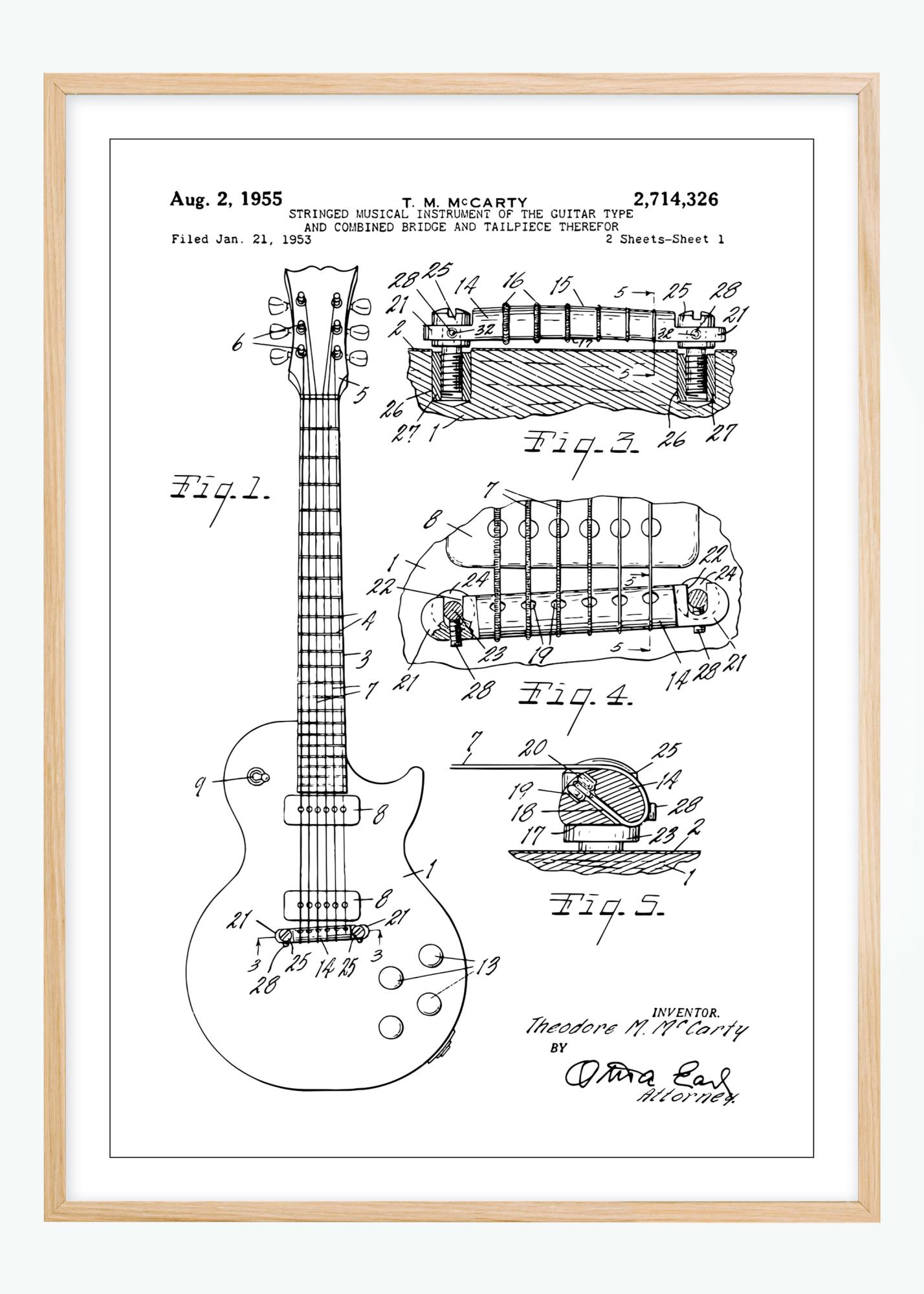 Tento patentový plagát zobrazuje podrobný nákres strunového hudobného nástroja, konkrétne gitary, ktorý bol zdokumentovaný vynálezcom Theodorom M. McCartym 2. augusta 1955 pod patentovým číslom 2,714,326. Nákres znázorňuje konštrukciu nástroja s kombinovaným mostíkom a struníkom, inovatívnym dizajnom, ktorý prispel k tónu a hrateľnosti gitary. Rôzne pohľady poskytujú nahliadnutie do mechanických a estetických aspektov dizajnu gitary.