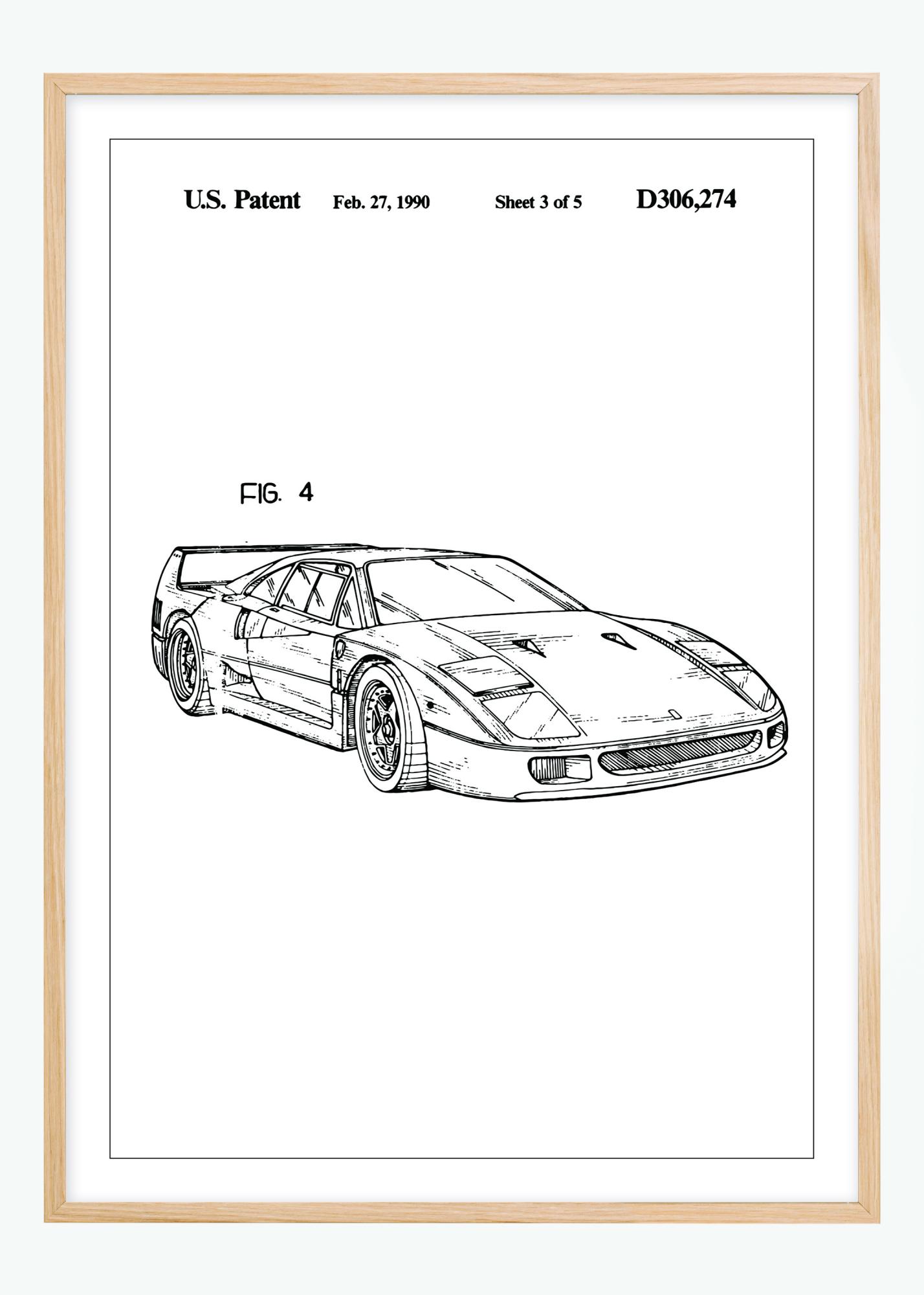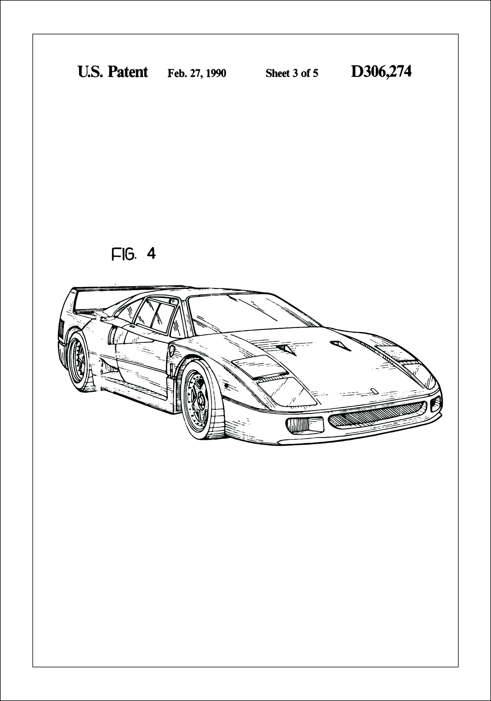 Tento patentový plagát zobrazuje prelomový dizajn Ferrari F40, detailne vyrobený 27. februára 1990, pod patentovým číslom D306,274. Ilustrácia ukazuje bok toho, čo sa stane jedným z najikonickejších športových áut v histórii, známeho svojou aerodynamikou a výrazným štýlom. Je to obraz inovácií a pokroku v automobilovom priemysle, ktorý zachytáva oko pozorovateľa svojimi ostrými líniami a dynamickým tvarom.