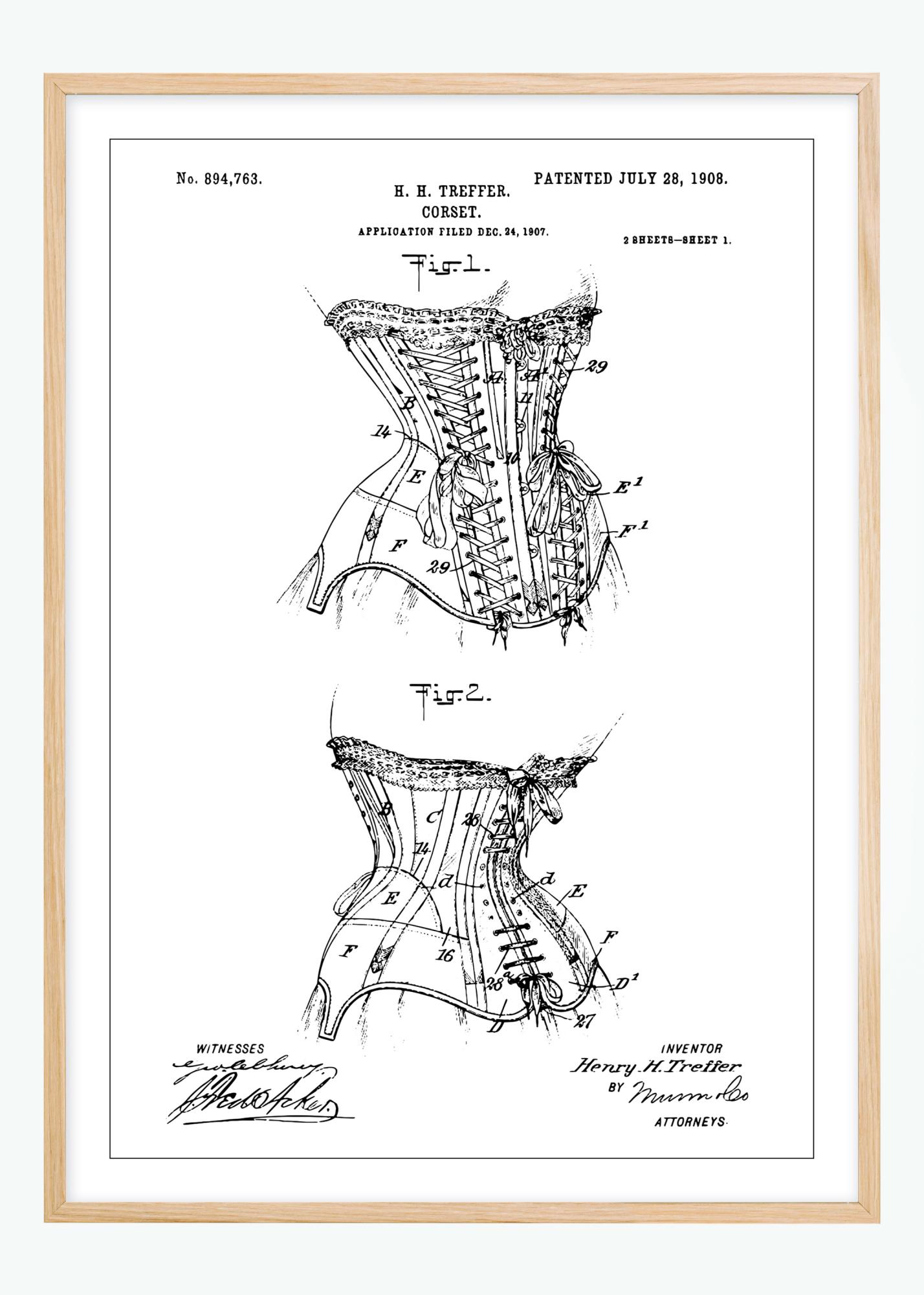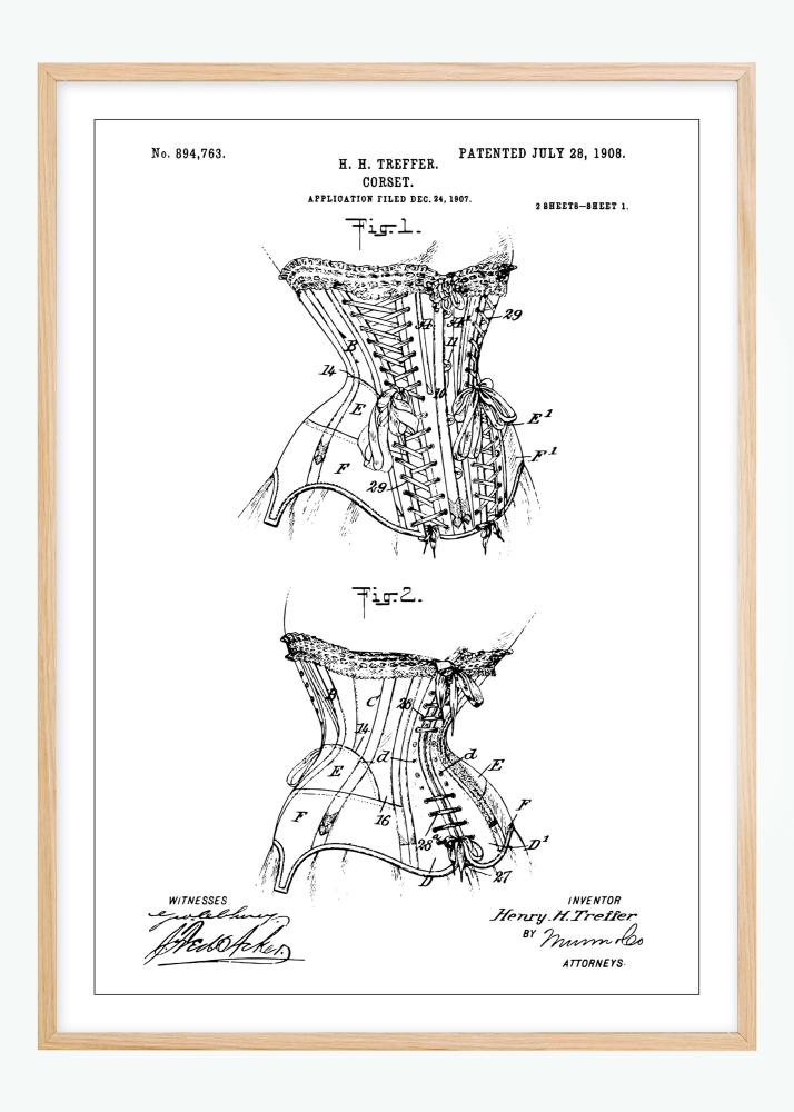 Táto patentová poster zobrazuje kresbu korzetu, inováciu v módnom dizajne, ktorá bola patentovaná Henrym H. Trefferom 28. júla 1908 s patentovým číslom 894,763. Ilustrácie ukazujú detailné prevedenie korzetu s jeho zaväzovaním a štruktúrou, čo zvýrazňuje tvorbu oblečenia obdobia a jeho zameranie na siluetu a formu.
