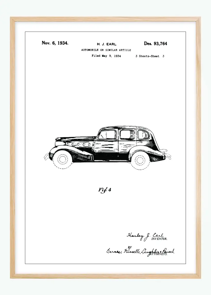 Tento patentový plagát zobrazuje automobil, ktorý bol patentovaný H.J. Earlom dňa 6. novembra 1934 pod patentovým číslom Des. 93,764. Vynález sa týka automobilu alebo podobného článku, ako bolo uvedené v žiadosti podanej 9. mája 1934. Nákres predstavuje bočný pohľad na vozidlo, ktorý poskytuje jasnú predstavu o jeho dizajne a proporciách typických pre toto obdobie.