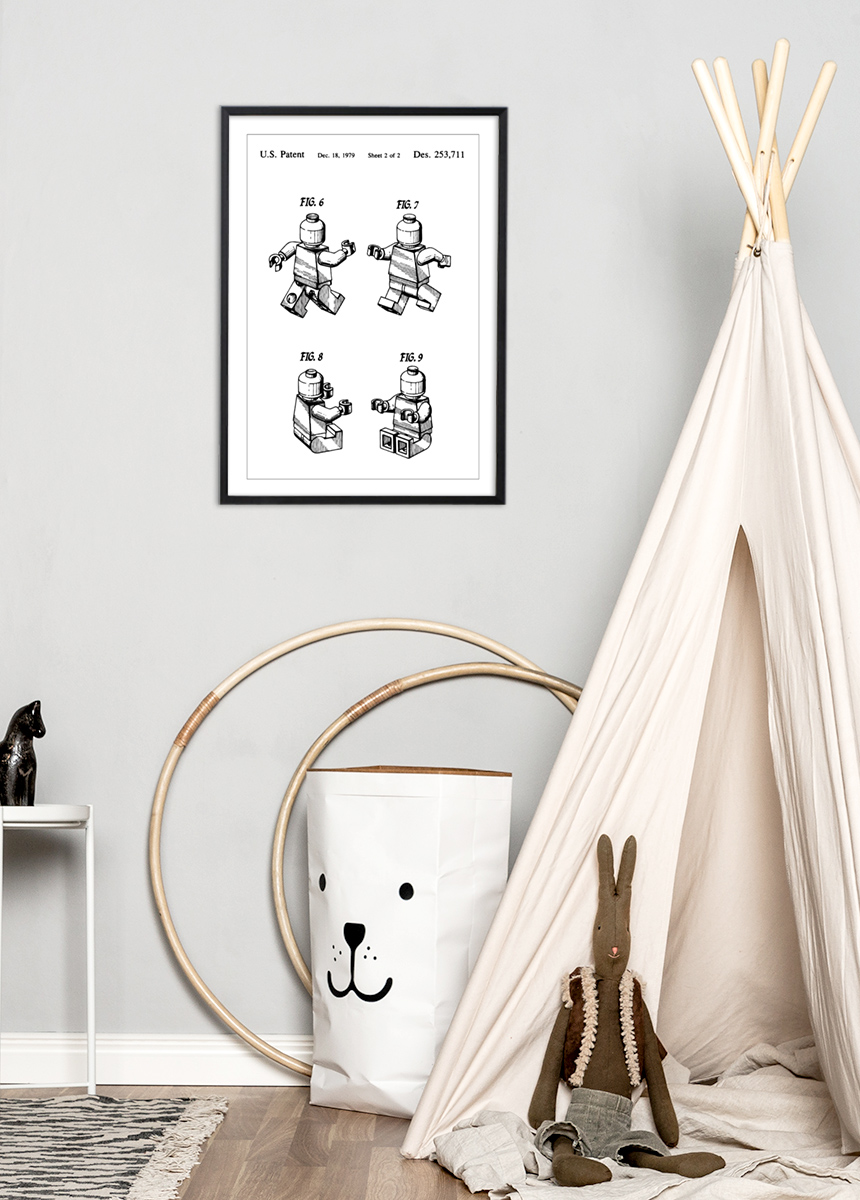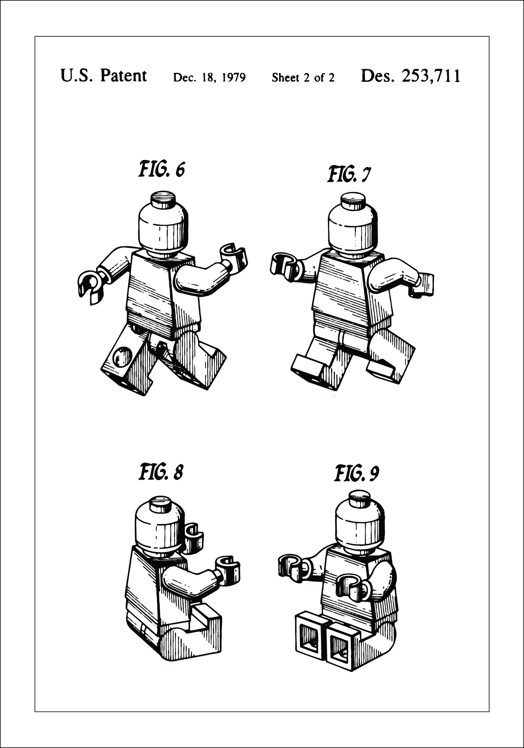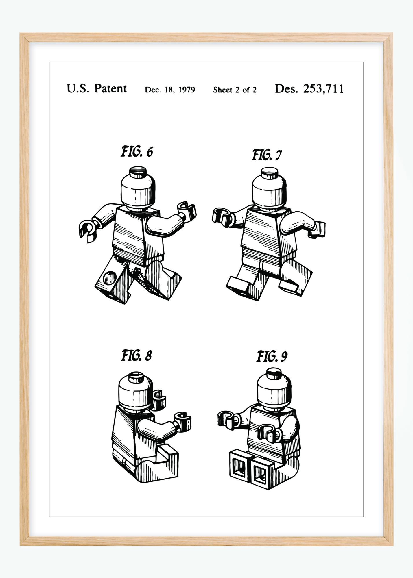 Tento patentový plagát zobrazuje figúrku Lego, ktorá bola zaznamenaná v americkom patentovom úrade 18. decembra 1979 pod patentovým číslom Des. 253,711. Ilustrácia ukazuje štyri rôzne pozície hračkárskej figúrky, čo poskytuje dynamické a trojrozmerné vnímanie jej dizajnu a funkčnosti. Každý obrázok zobrazuje pohyblivosť figúrky a rôzne pózy, ktoré môže zaujať.