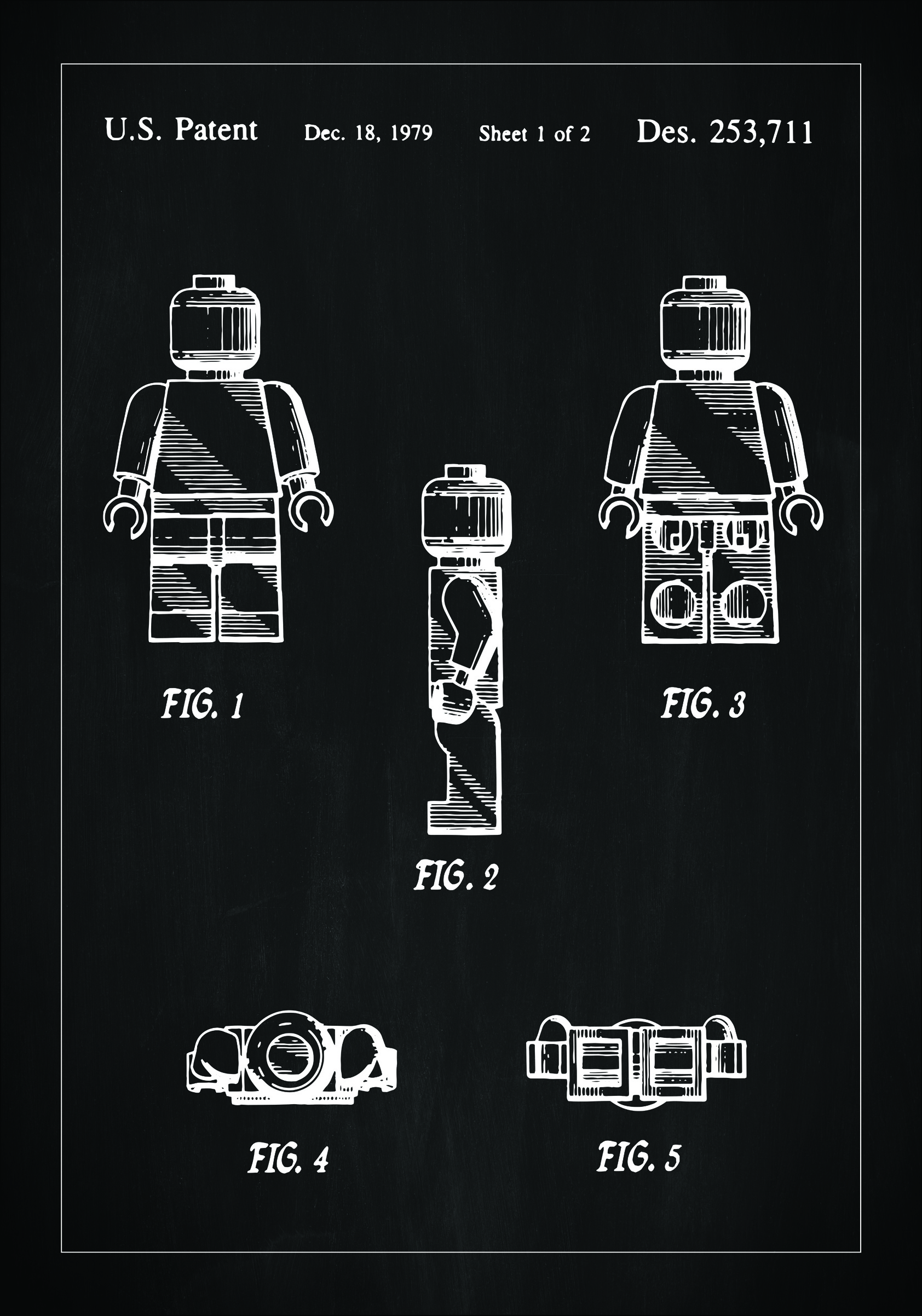 Táto patentová poster zobrazuje vynaliezavosť v dizajne hračiek, reprezentovanú prostredníctvom patentu Des. 253,711 datovaného na 18. december 1979. Patentový výkres ukazuje rozdelenú konštrukciu hračkovej figúrky z Lega, prezentovanú v niekoľkých pohľadoch: spredu, z boku a detailné pohľady na hlavu a telo. Päť figúrok je očíslovaných a demonštruje schopnosť hračky byť rozobratá a opäť zložená, funkciu, ktorá inšpirovala celú generáciu dizajnérov hračiek.