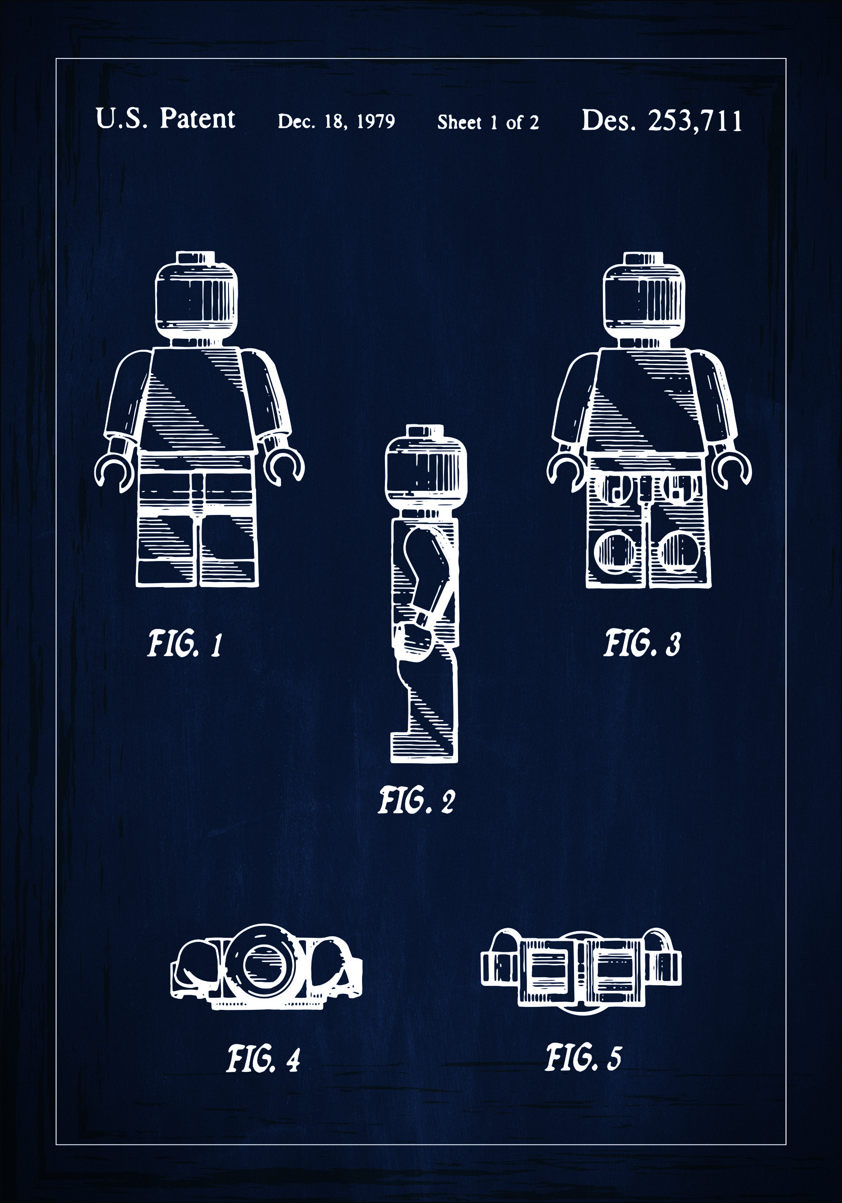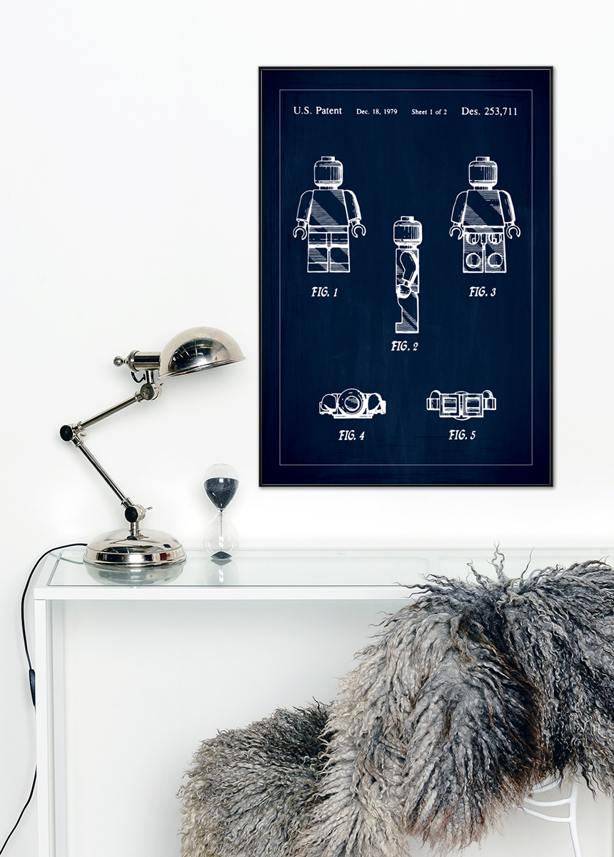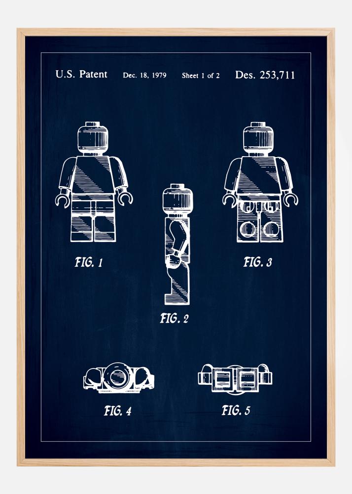 Tento jedinečný patentový plagát zobrazuje klasickú hračkovú figúrku od Lego, ktorá má špeciálne miesto v srdciach detí aj dospelých. Detailný motív je autentickou kópiou pôvodného patentového výkresu, archivovaného 18. decembra 1979, s patentovým číslom Des. 253,711. Umeleckým spôsobom prezentovaný na tmavom pozadí, technická ilustrácia sa transformuje na štýlové umelecké dielo, ktoré vzdáva hold inovácii a dizajnu. Perfektný pre milovníkov interiérového dizajnu alebo zberateľov, tento patentový plagát je pocta nadčasovej kreativite a hravosti.