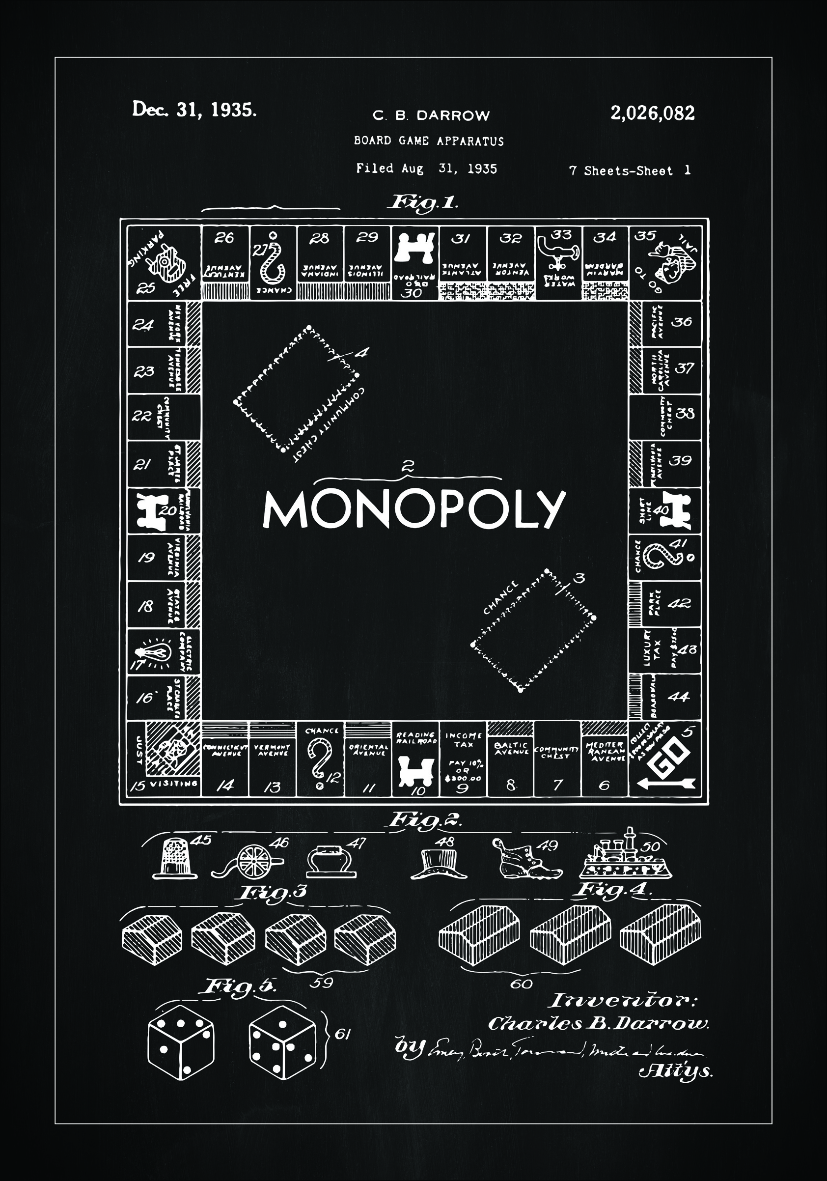 Tento patentový plagát oslavuje jednu z najikonickejších doskových hier v histórii: Monopoly, s patentovým číslom 2,026,082, udeleným Charlesovi B. Darrowovi dňa 31. decembra 1935. Na tejto detailnej ilustrácii vidíme klasické usporiadanie hracej plochy, vrátane dobre známych ulíc a železničných staníc, kociek a charakteristických hracích figúrok.