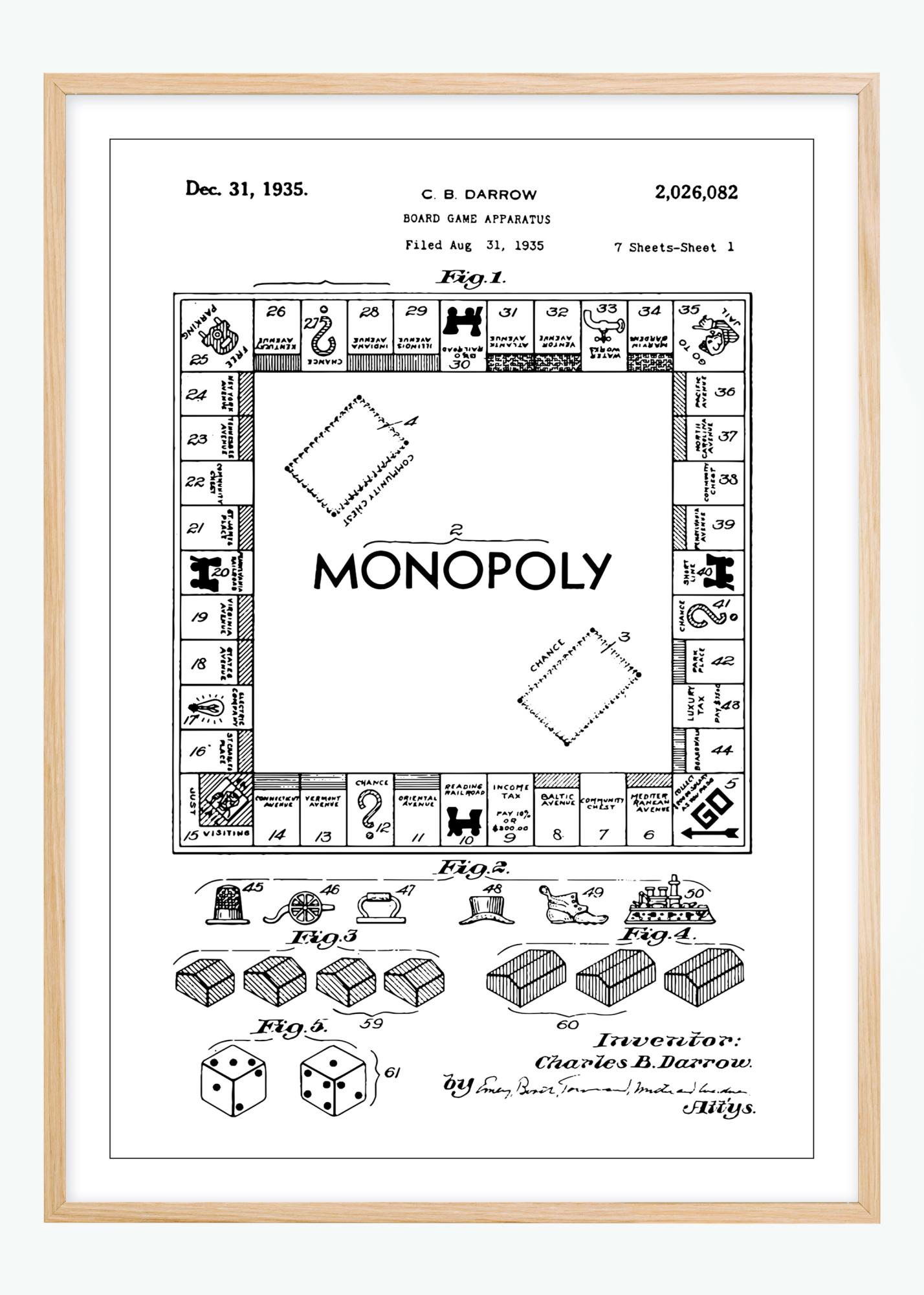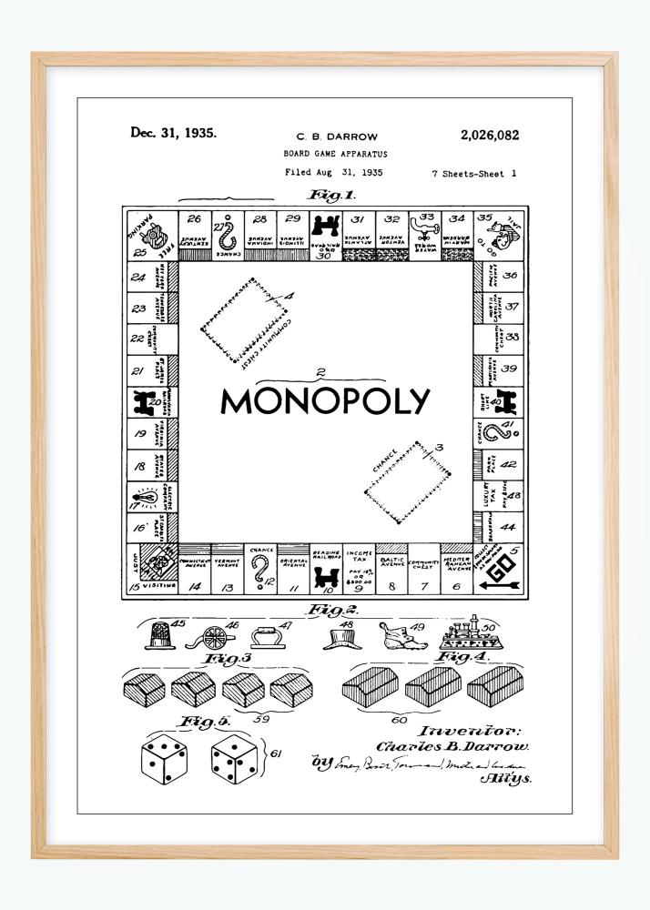 Tento patentový plagát zobrazuje klasický dizajn obľúbenej spoločenskej hry Monopoly, ktorú kultúra považuje za ikonu rodinnej zábavy a hier. Dáta ukazujú, že vynálezca Charles B. Darrow podal žiadosť o patent 31. augusta 1935 a bol mu udelený 31. decembra toho istého roku pod číslom 2,026,082. Detailný výkres predstihuje prehľad herného plánu, kompletný s dobre známymi políčkami "štart", "šanca" a majetkovými kartičkami, ako aj ikonickými hracími figúrkami a kockami, čo dodáva nostalgický pocit a uznanie pre túto nadčasovú hru.