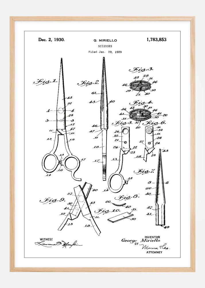 Štýlový a poučný, tento patentový plagát zobrazuje inovatívny dizajn nožníc od G. Mirella, patentovaný 2. decembra 1930 pod číslom 1,783,853. Ide o vzdelávací pohľad na vývoj nástroja z ranného 20. storočia, od presne naostrených čepelí po umelecky vytvarované rukoväte. Každý detail v patentovej kresbe je zhotovený s presnosťou, čo ukazuje technickú zručnosť a dizajnérsku schopnosť, ktoré charakterizovali vynálezy tej doby.