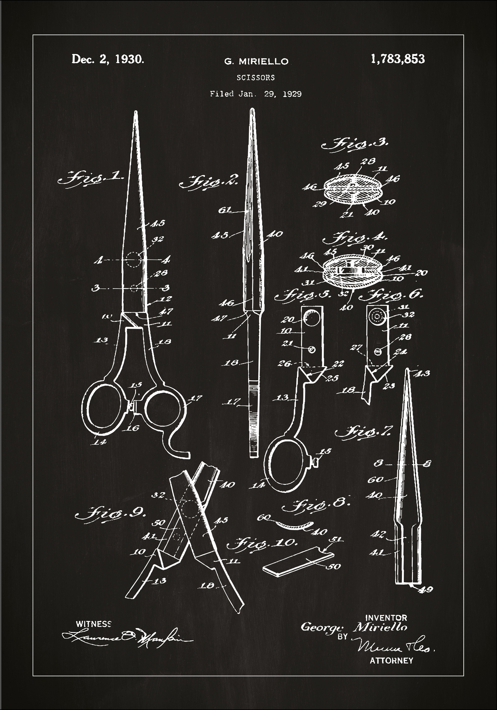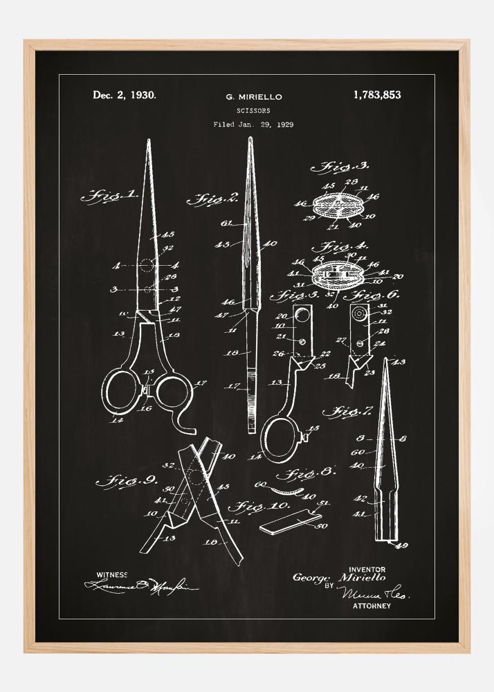 Táto výrazná patentová fotografia je poctou klasickému dizajnovému symbolu - nožniciam. Zobrazuje patent G. Mirella, ktorý bol vydaný 2. decembra 1930 s číslom patentu 1,783,853, po tom, čo bol podaný 29. januára 1929. S precíznymi skicami, ktoré ukazujú rôzne uhly a časti nožníc, od ostrých čepelí po ergonomicky tvarované rúčky, táto patentová kresba zachytáva samotnú podstatu remeselnej práce a dizajnu.