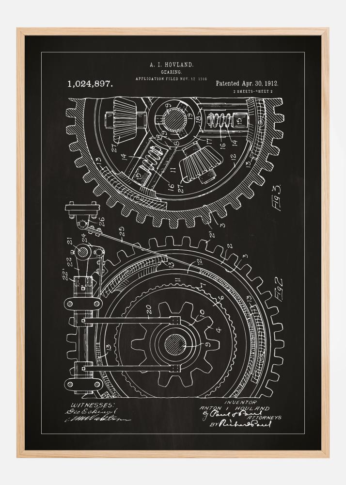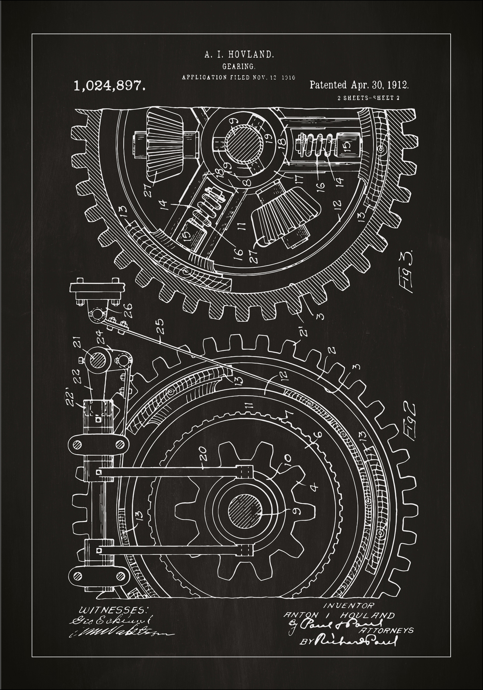 Tento podrobný patentový plagát zobrazuje zložitý dizajn prevodovky A. I. Hovlanda, chránený patentovým číslom 1,024,897, udelený 30. apríla 1912. Pokročilá konštrukcia, ktorá je zobrazená na tomto náčrte, je fascinujúcim príkladom rannej mechanickej inžinierstva. Každý zub a súčiastka sú zobrazené s presnosťou, ktorá poskytuje pohľad do mechanizmov a vynálezov priemyselnej éry. Je to vynikajúca pamiatka pre každého, kto má záujem o strojárstvo a priemyselnú históriu.
