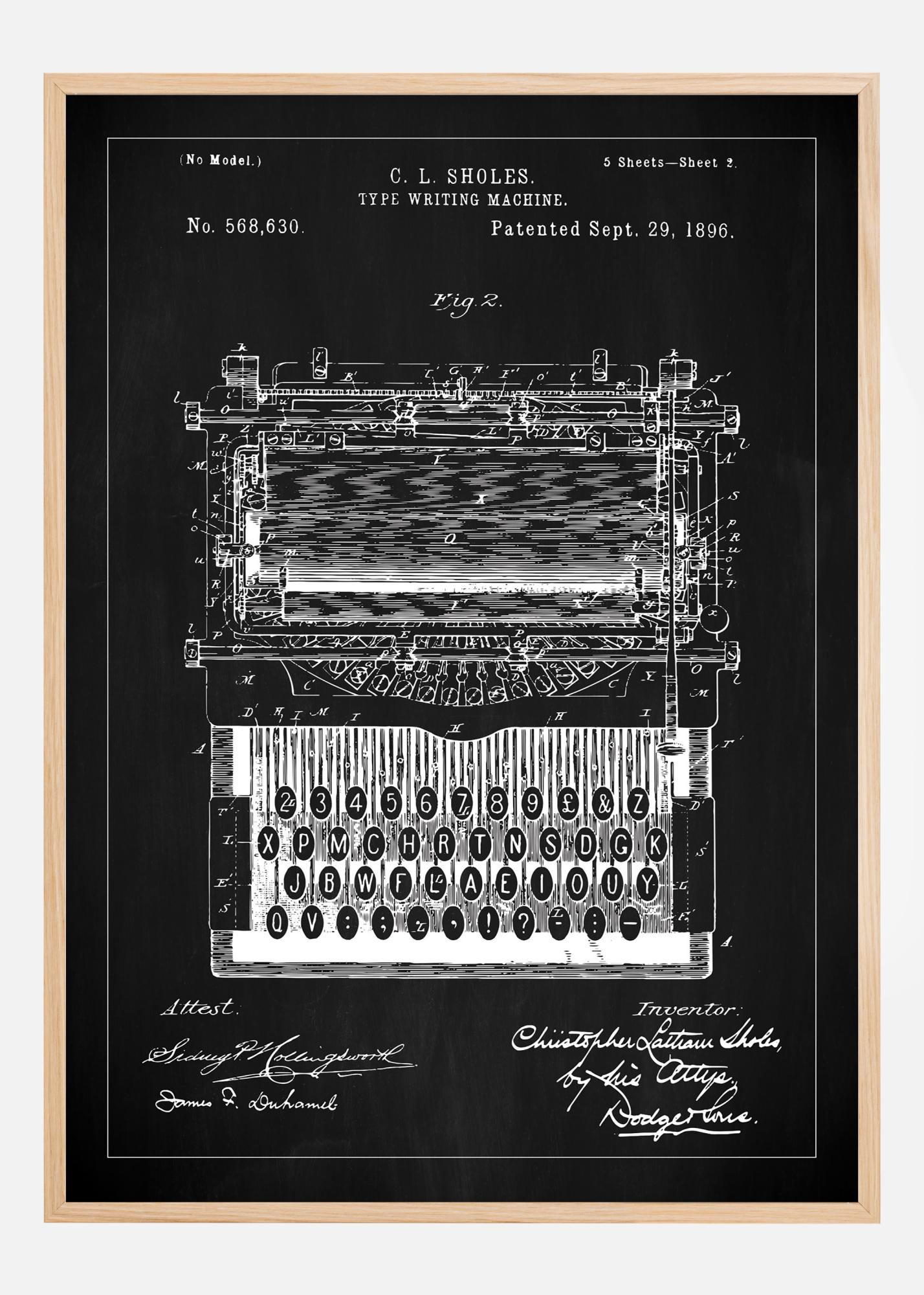 Tento ikonický patentový plagát zobrazuje historický patent č. 568 630, udelený 29. septembra 1896 C. L. Sholesovi na písací stroj. Veľkolepá ilustrácia ukazuje mechanickú zložitosť raného písacieho stroja, kompletného s usporiadaním kláves a vnútornými mechanizmami. Detaily, ako je zložitý typový mechanizmus a krásne usporiadaná klávesnica, sú výrazné na hlbokom čiernom pozadí a dodávajú pocit vintage elegancie.