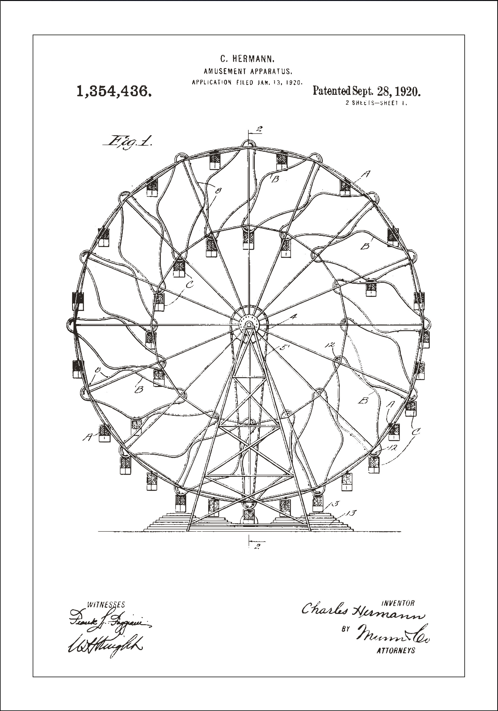 Tento patentový poster zobrazuje vynález C. Hermanns, zábavné zariadenie navrhnuté pre radosť a vzrušenie, udelené pod číslom patentu 1,354,436 dňa 28. septembra 1920. Dizajn predstavuje klasické a obľúbené ruské kolo, symbol zábavných parkov po celom svete. Tento precízny technický výkres zachytáva zložitosť štruktúry a je poctou k raným dňom zábavného priemyslu.