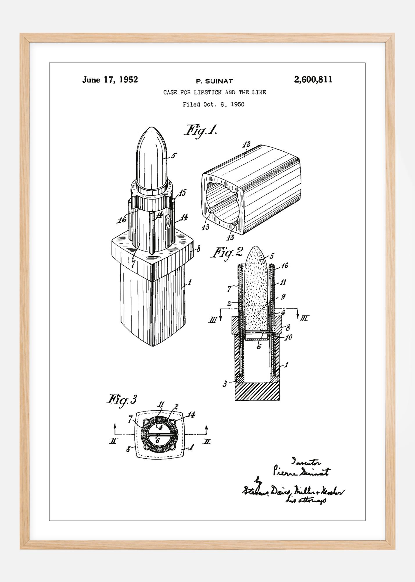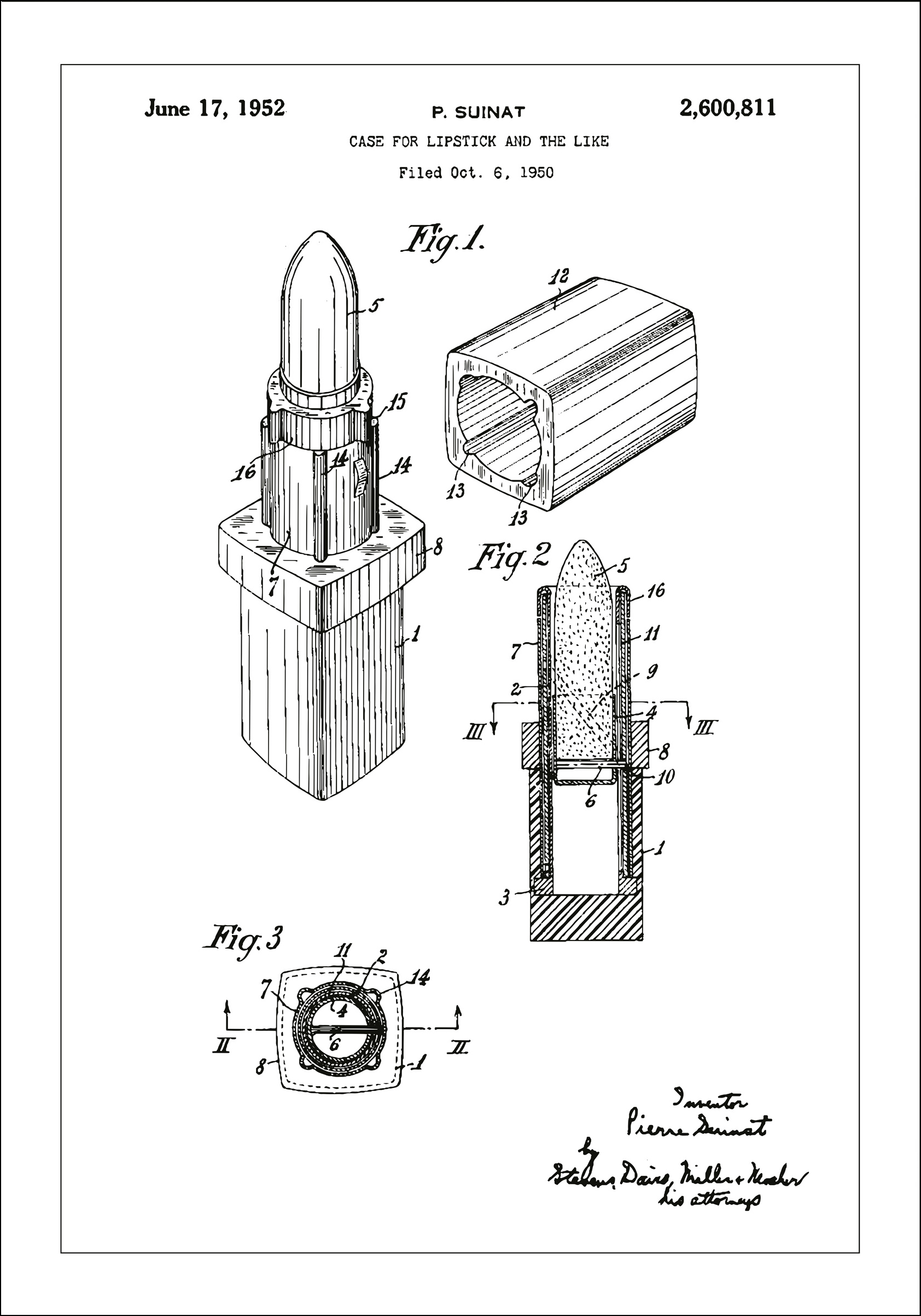 Tento štýlový patentový poster znázorňuje inovatívny dizajn puzdra na rúž, ktorý bol udelený P. Suinatovi pod patentovým číslom 2,600,811 dňa 17. júna 1952 po podaní žiadosti 6. októbra 1950. Detailná ilustrácia zobrazuje klasický dizajn kozmetického doplnku, ktorý poskytuje pohľad na technický a estetický vývoj v kozmetickom priemysle. Čisté línie a precízne spracovanie posteru z neho robia ideálny interiérový doplnok pre kozmetické salóny, make-up štúdiá alebo ako jedinečné umenie na stenu pre každého, kto oceňuje vintage kozmetické doplnky a dizajn.
