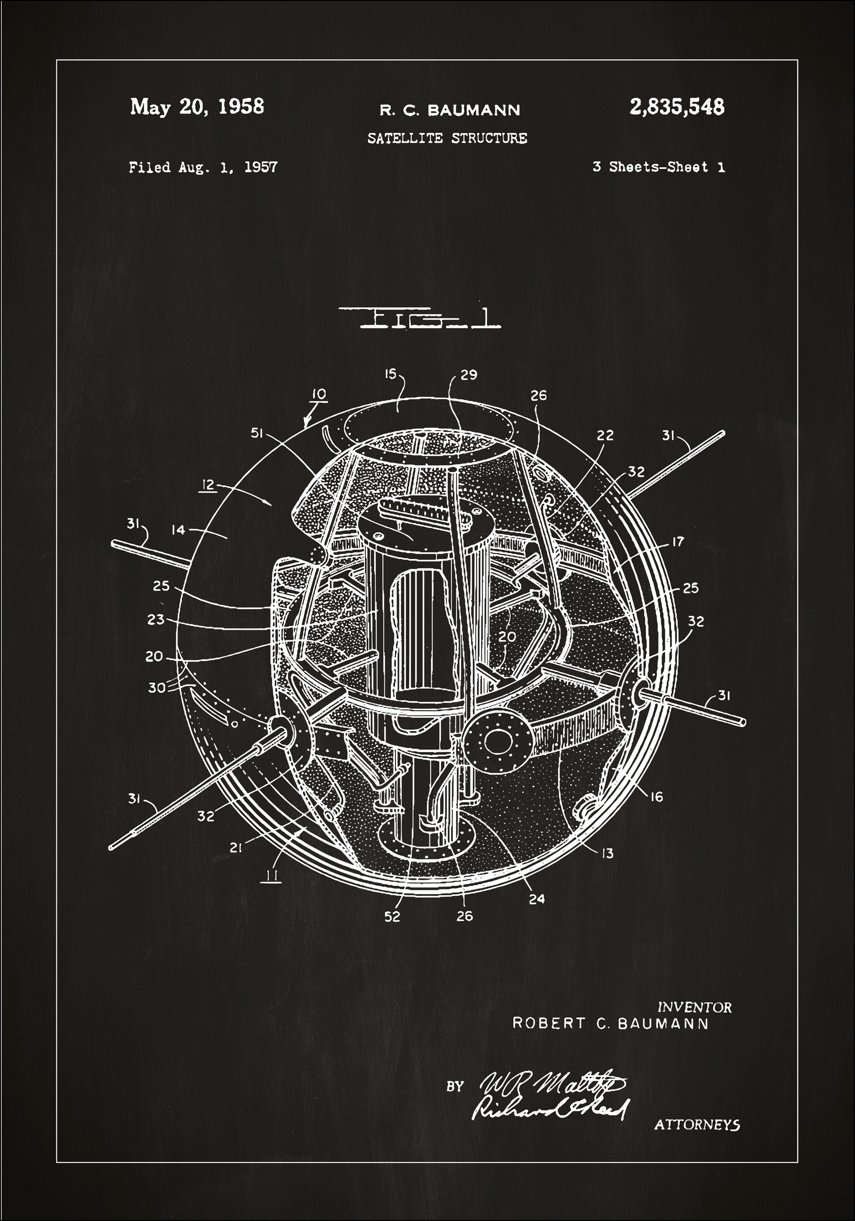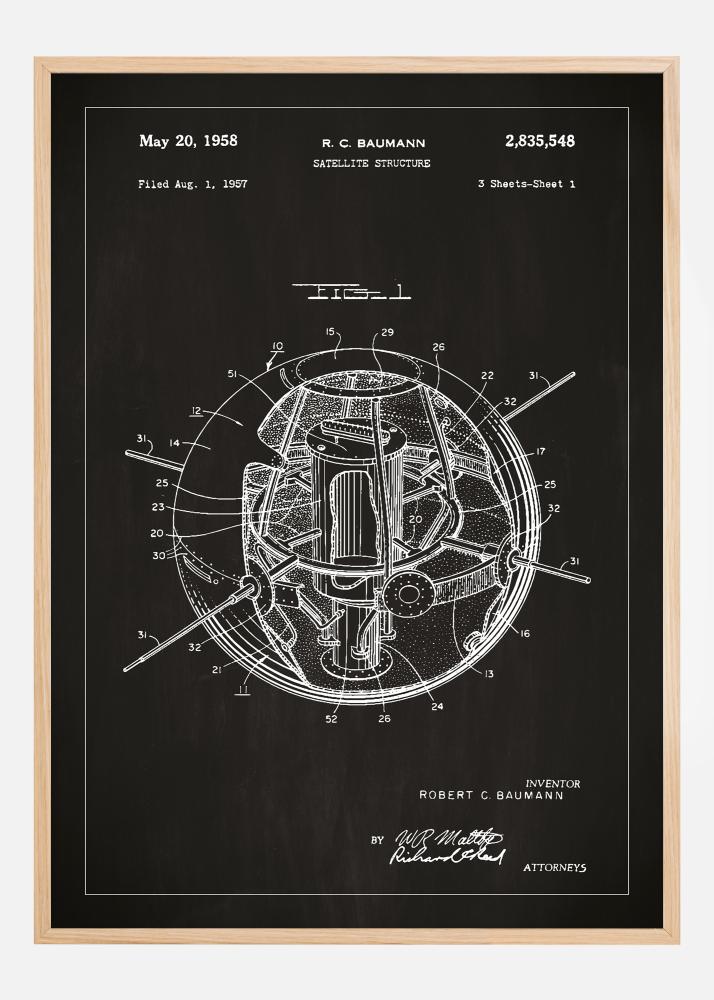 Tento výrazný patentový plagát zobrazuje prelomovú konštrukciu v úsvite vesmírnej technológie: R.C. Baumannov "Satelitný štruktúra", patentovaný 20. mája 1958, s patentovým číslom 2,835,548. Podaný 1. augusta 1957, táto podrobná patentová kresba ukazuje skorý model umelej družice, vrátane jej komponentov a unikátnych geometrických konfigurácií, čo odhaľuje inovatívneho ducha éry vesmírnych pretekov.
