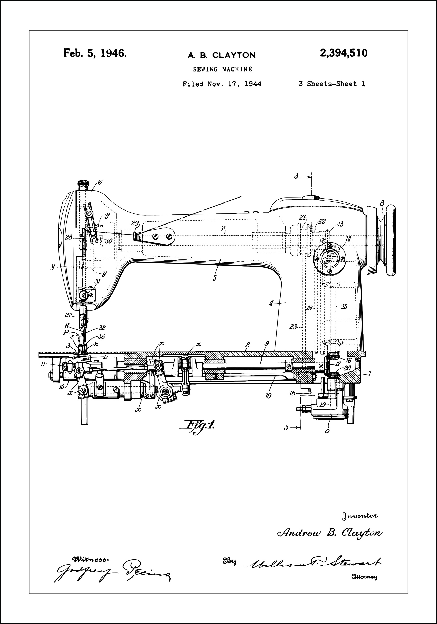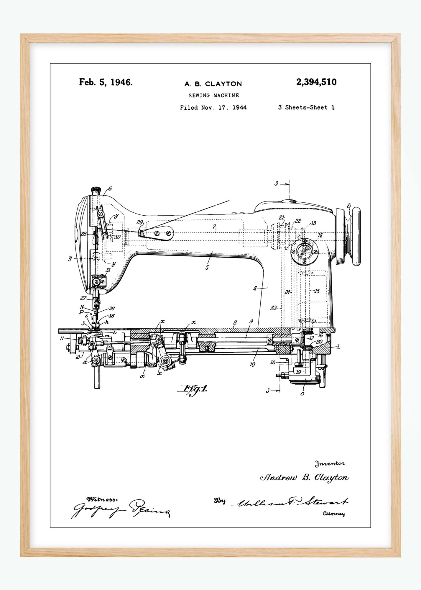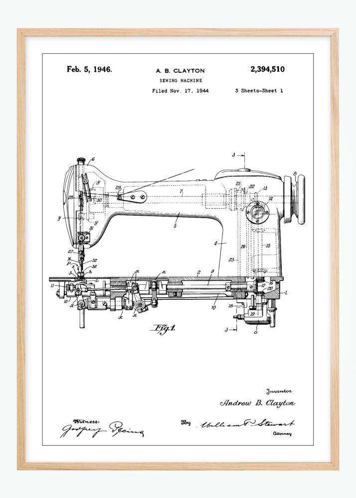 Tento podrobný patentový nákres šijacieho stroja je dokonalou ilustráciou priemyselného umenia a inovácie, podpísaný vynálezcom Andrew B. Clayton. Autorské práva sú datované na 5. februára 1946 a uložené 17. novembra 1944, tento patentový plagát prezentuje klasické remeslo a presnosť za strojovým šitím. So svojimi komplexnými komponentmi a technickými čiarami ponúka tento patentový plagát jedinečný pohľad na technické pokroky začiatku 20. storočia a je štýlovým interiérovým prvkom pre každého, kto oceňuje historické inovácie.