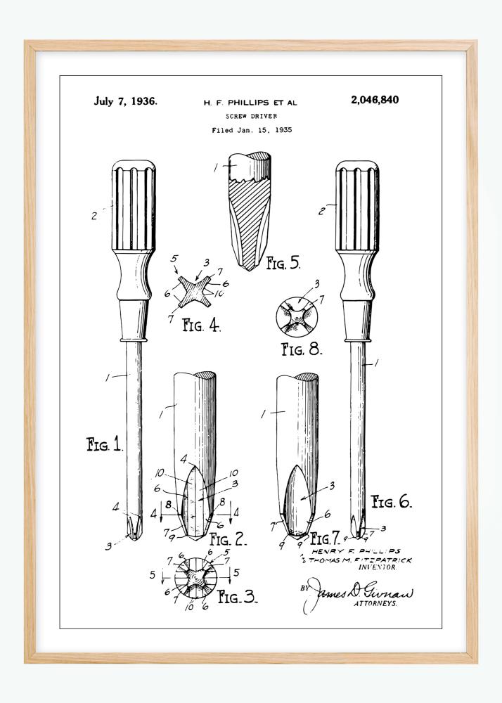 Predstavený tu je klasický patentovaný plagát, ktorý zobrazuje dizajn skrutkovača, nepostrádateľnú pomôcku v každej dielni. Dátovaný na 7. júla 1936 a archivovaný 15. januára 1935, tento patentový plagát s presnými detailmi zobrazuje konštrukciu a inováciu za týmto nástrojom, od jeho ikonickej rukoväte až po jedinečný tvar hrotu. Vynálezcovia H.F. Phillips a ďalší vytvorili týmto patentom, číslo 2,046,840, štandard v nástrojárskom priemysle, na ktorý sa stále spoliehame dodnes.