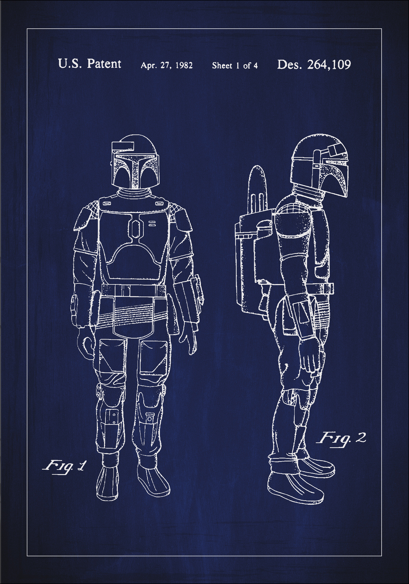 Táto elegantná patentová poster je poctou inovácii a neúnavnej ľudskej kreativite. S patentovým výkresom datovaným 27. apríla 1982, zobrazuje Des. 264,109 brnenie Boby Fetta zo Star Wars, ktorého dizajn je funkčný aj fascinujúci. Táto poster je dokonalá pre každého, kto si cení mix vedy a umenia, a ponúka jedinečný pohľad do procesu priemyselného dizajnu.