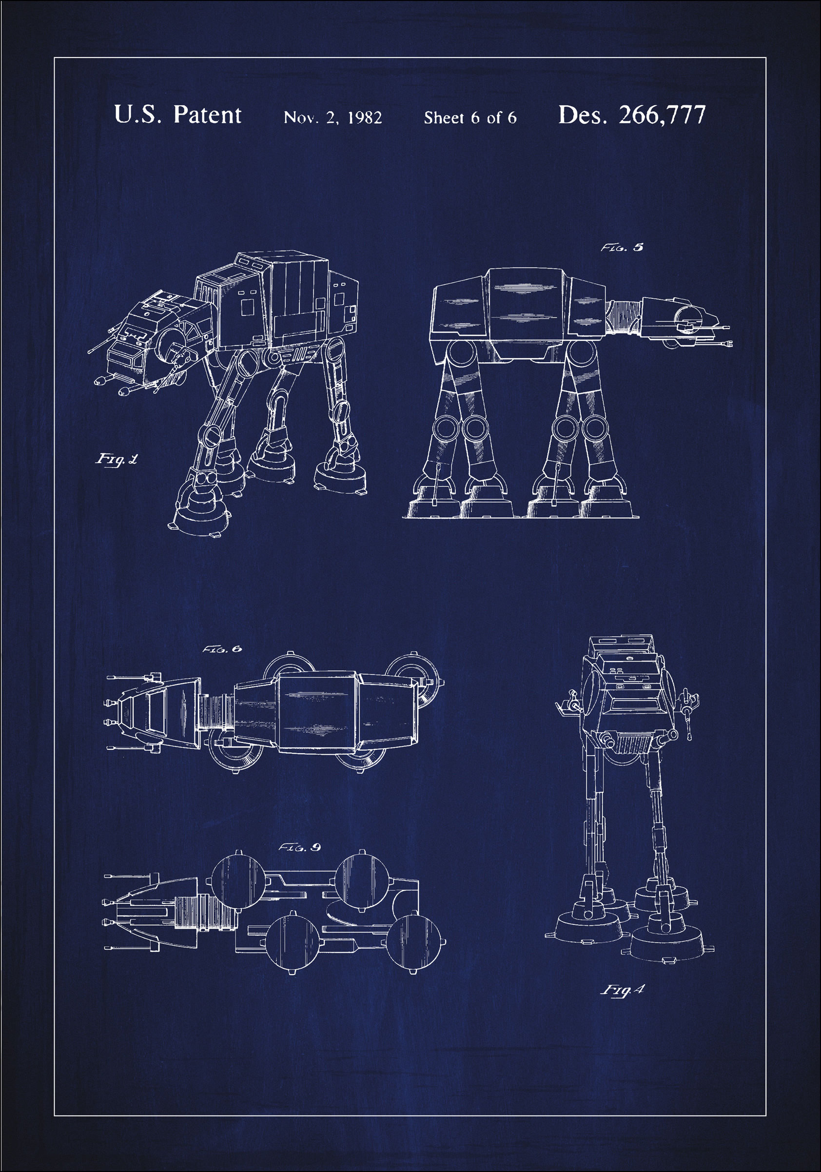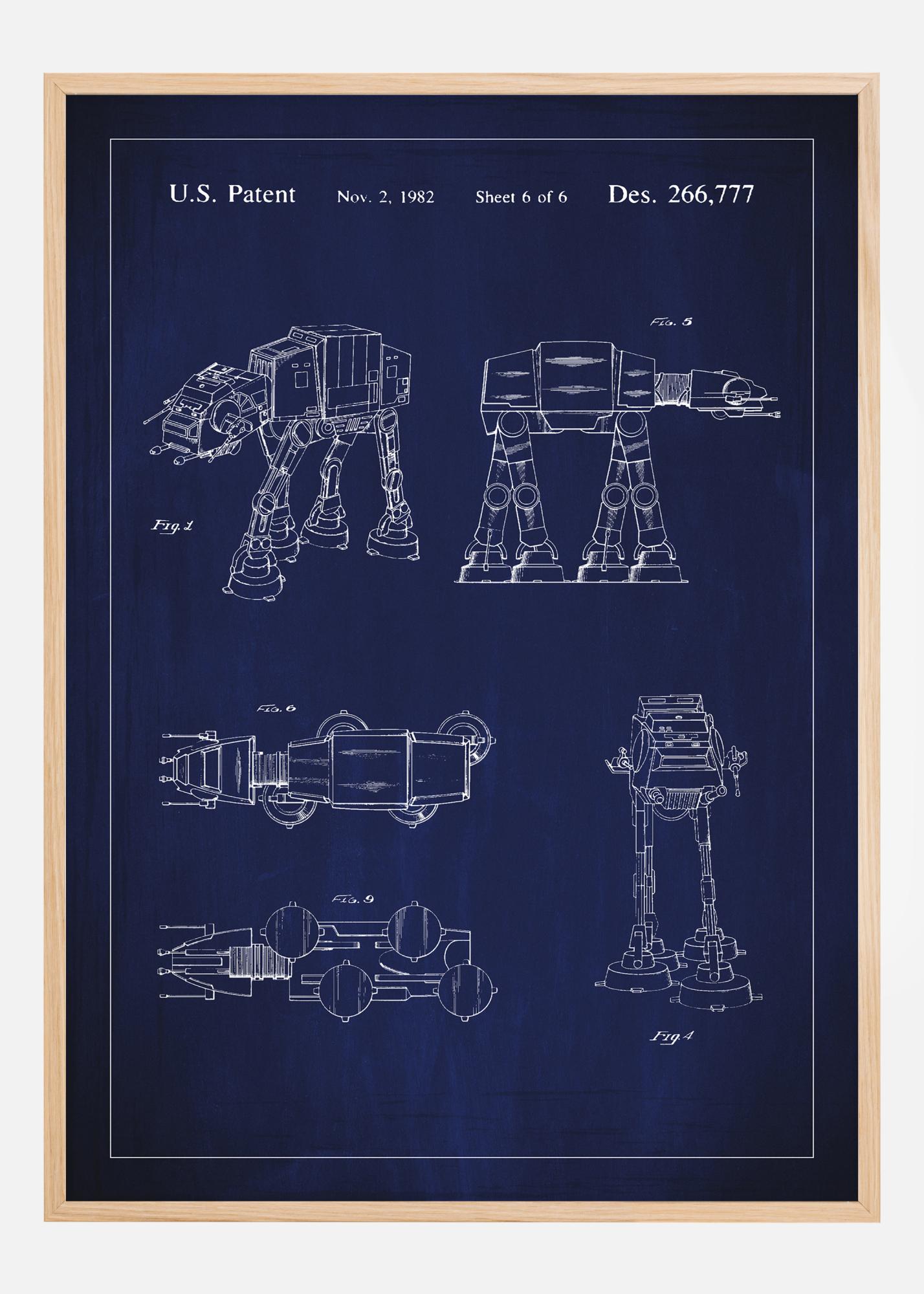Tento umelecký patentposter zobrazuje výrazné konštrukčné nákresy zo slávneho dizajnového patentu Des. 266,777, registrovaného 2. novembra 1982. Motív zobrazuje technické nákresy ATAT zo Star Wars v niekoľkých pohľadoch, z ktorých každý demonštruje jedinečnú štruktúru a funkcie zariadenia. Je prezentovaný na tmavomodrom pozadí, čo dodáva elegantný a moderný vzhľad bielym čiarovým ilustráciám.