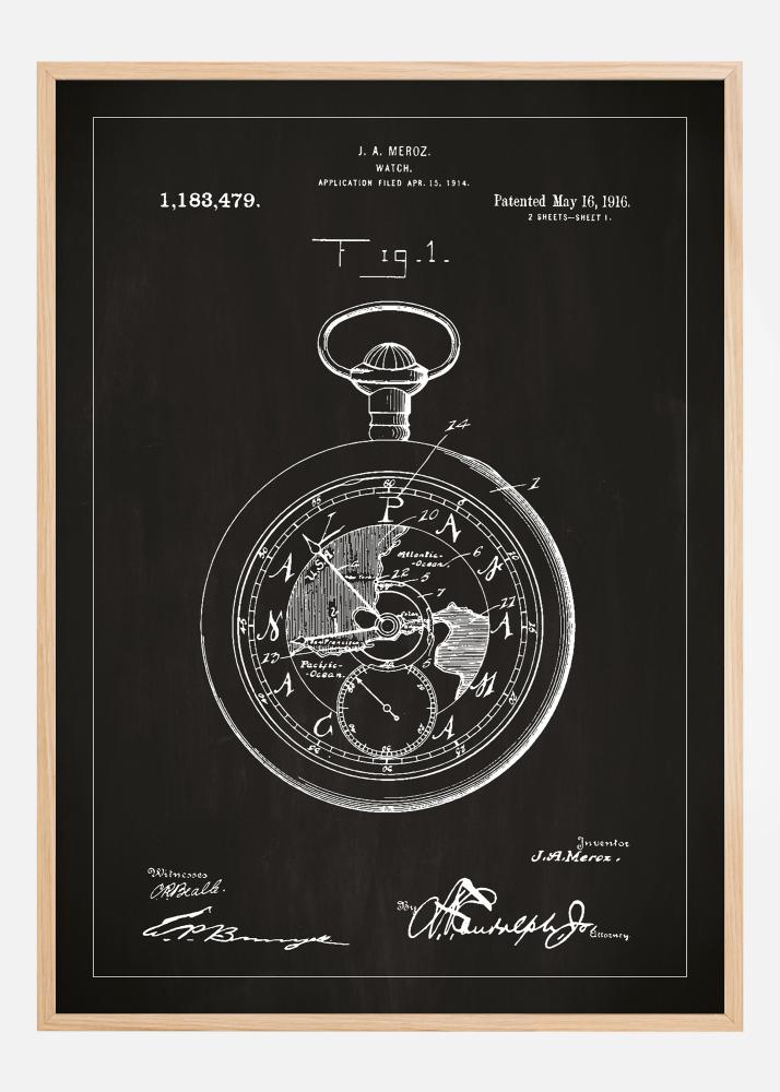 Tento sofistikovaný patentný plagát zobrazuje nadčasový vynález vreckových hodiniek, patentovaný J.A. Merozom 16. mája 1916 pod patentovým číslom 1,183,479. Detailný patentový výkres ukazuje prepracovaný dizajn strojčeka, kompletný s mechanickými detailmi, ktoré odrážajú éru, keď sa presnosť v meraní času stala umením samým o sebe.