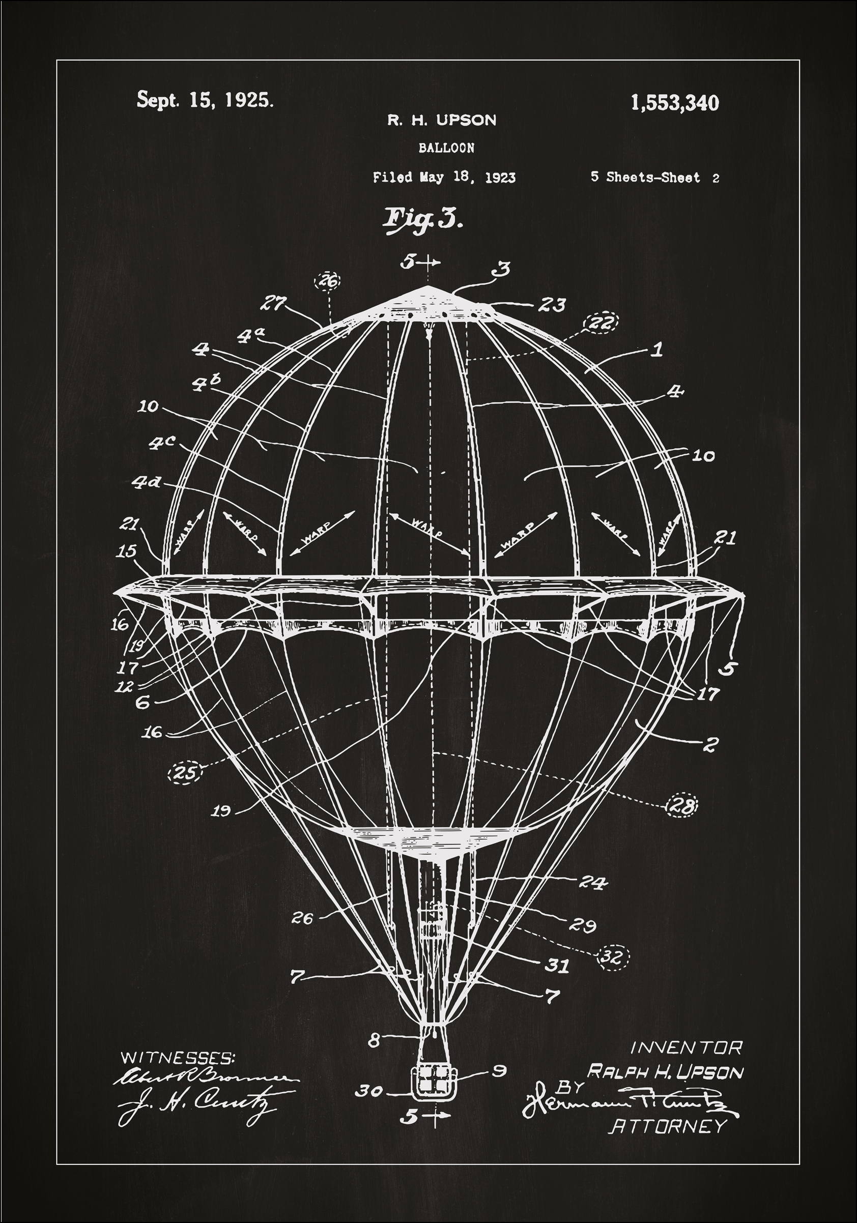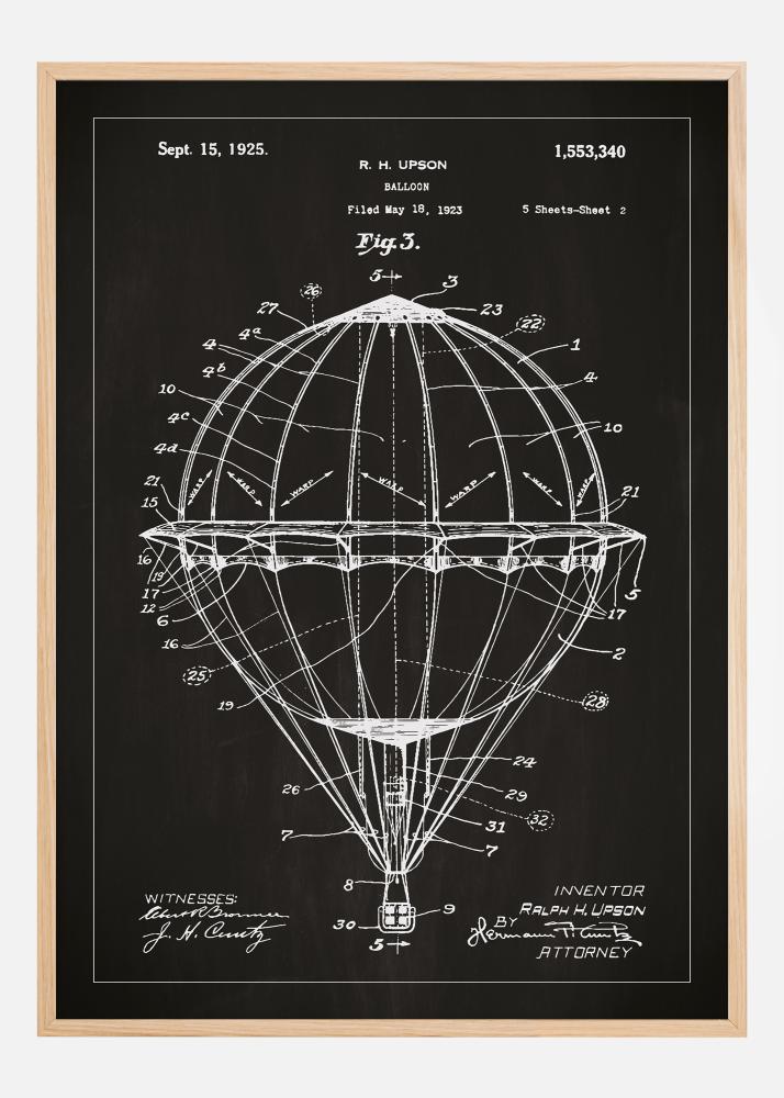 Tento jedinečne vytvorený patentový plagát ilustruje podrobnú konštrukciu teplovzdušného balóna, ktorého pôvodný patent vytvoril inovátor Ralph H. Upson. Patentovaný 15. septembra 1925 pod číslom 1,553,340, je to fascinujúci príklad rannej aerodynamickej inžinierskej práce. Tento patentový plagát je poctou snu o vznášaní sa medzi oblakmi a ľudskej túžbe preskúmavať oblohu.