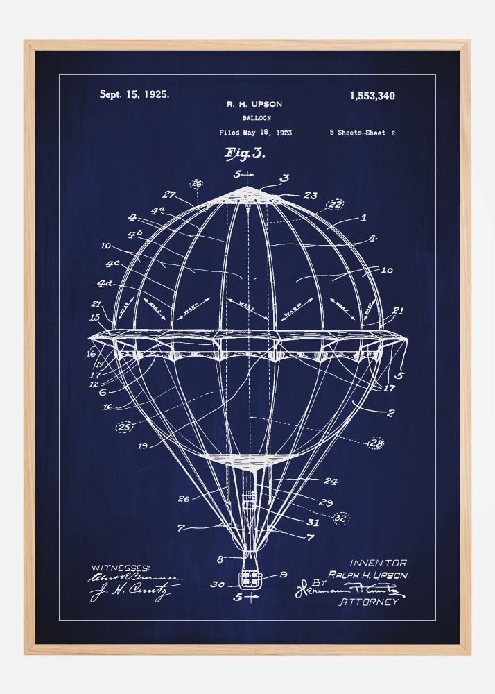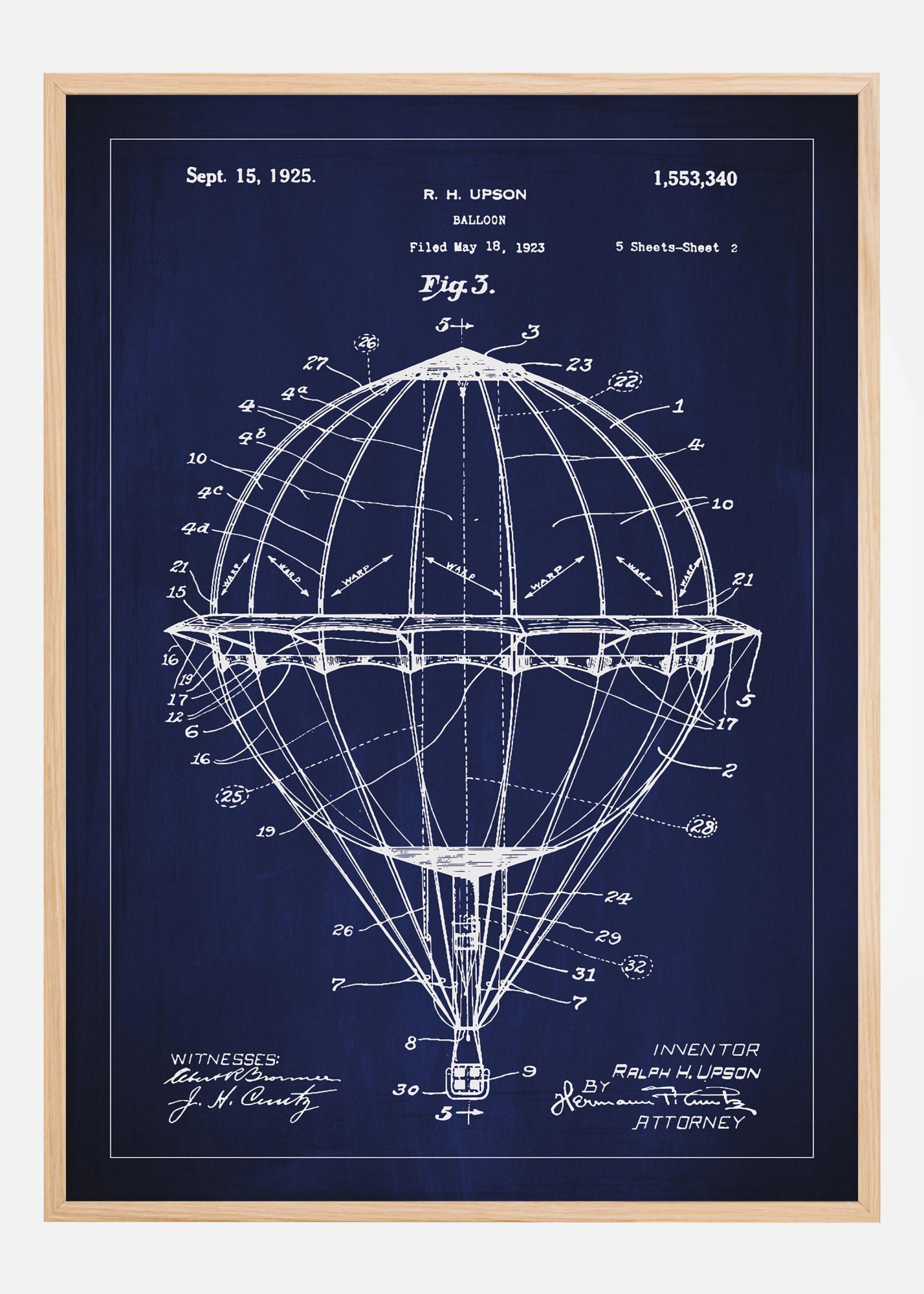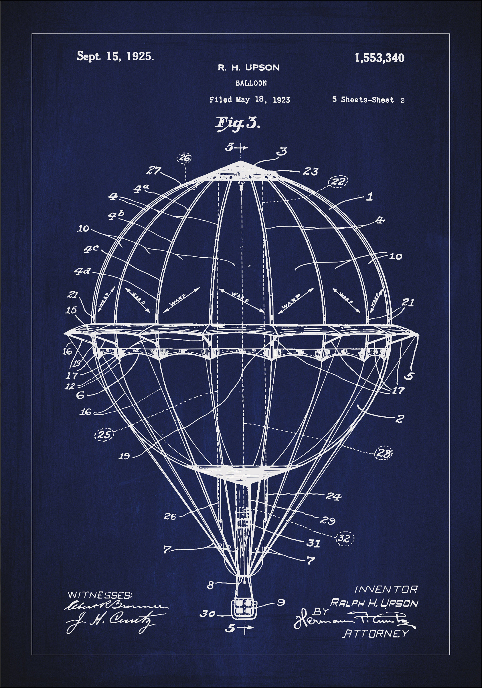 Pre skutočného nadšenca skorých pokrokov v oblasti leteckého inžinierstva ponúka tento patentový plagát pohľad na slávnu éru priekopníkov letectva. Predstavený 15. septembra 1925, táto patentová kresba, číslo 1,553,340, ilustruje vzduchový balón navrhnutý Ralphom H. Upsonom, ktorý predstavuje dôležitý míľnik v aerodynamickom dizajne a konštrukcii. Tento plagát je neoceniteľnou reprezentáciou ľudských snáh a snov o nebeských dobrodružstvách.