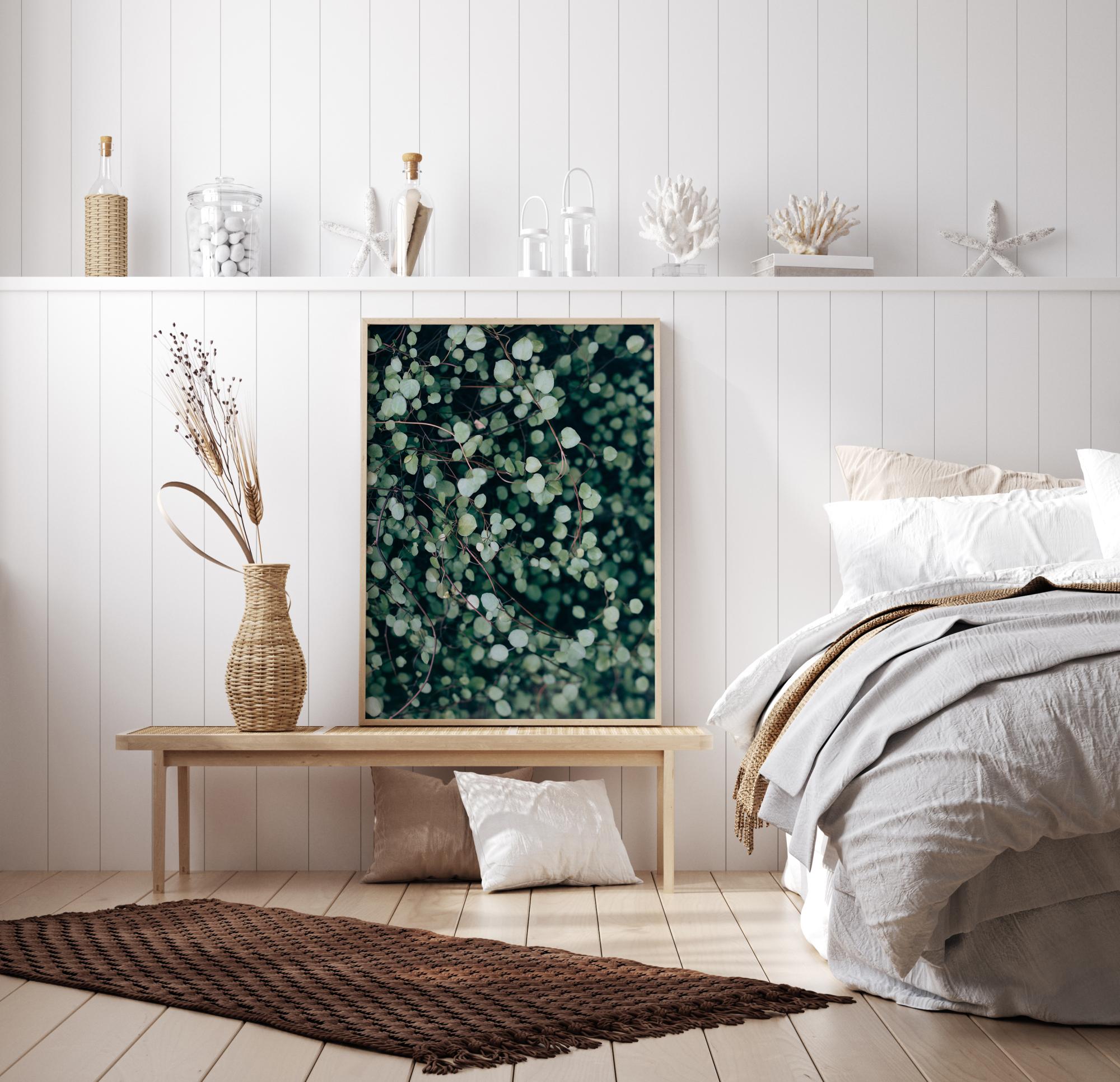 Krásny zelený detailný plagát so šplhavou rastlinou s mnohými listami a konármi. Malé, okrúhle lístky sa radostne lesknú na slnečnom svetle. Čierne pozadie necháva listy výrazne vyniknúť. Zaveste tento výtlačok na svetlozelenú stenu, aby ste miestnosti dodali upokojujúci nádych.