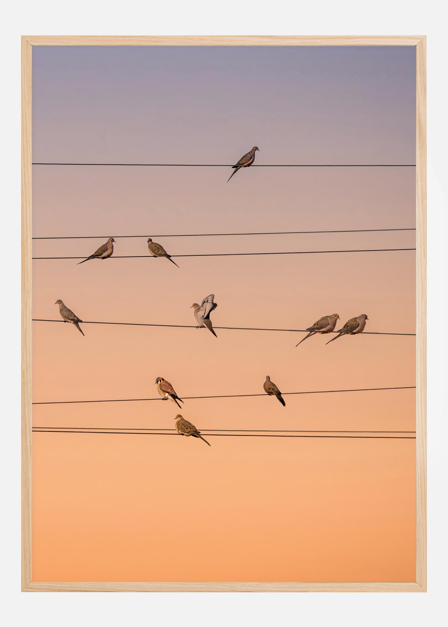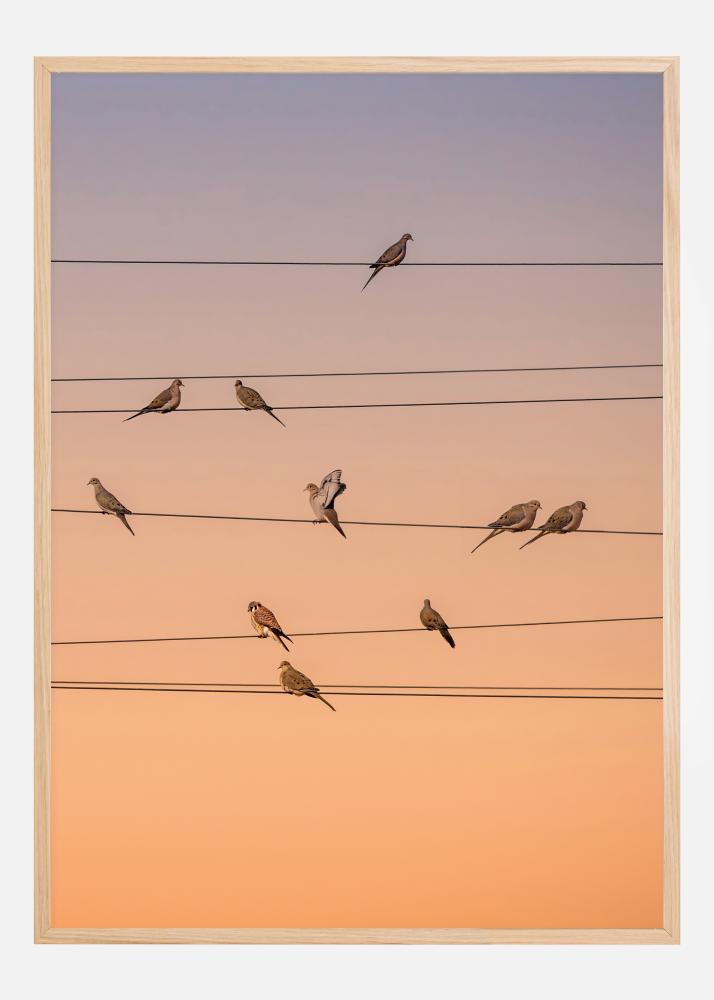 Úžasný plagát s vtákmi sediacimi na elektrických kábloch v oranžovom západe slnka. Vtáky a elektrické vedenia pripomínajú notový list, ktorý privádza myšlienky na spev vtákov. Tento obrázok sa hodí na všetky steny obývačky.