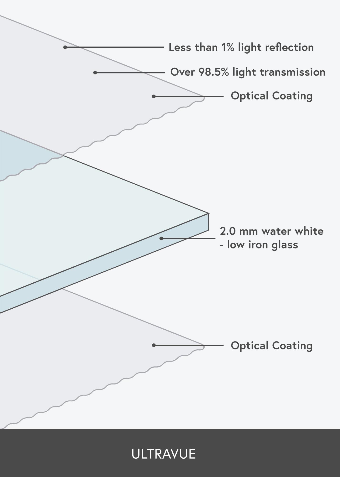 Vyhnite sa rušivým odrazom a zrkadleniam s pravým antireflexným sklom od spoločnosti Tru Vue. S odrazivosťou iba 1 % je sklo takmer neviditeľné a poskytuje vašim obrázkom prirodzené farby a pravý lesk. Ako bonus sklo taktiež poskytuje ochranu proti UV žiareniu a eliminuje 92 % škodlivých UV lúčov, čo zabezpečuje dlhú životnosť vašich obrázkov. UltraVue je tiež odolné voči poškriabaniu.