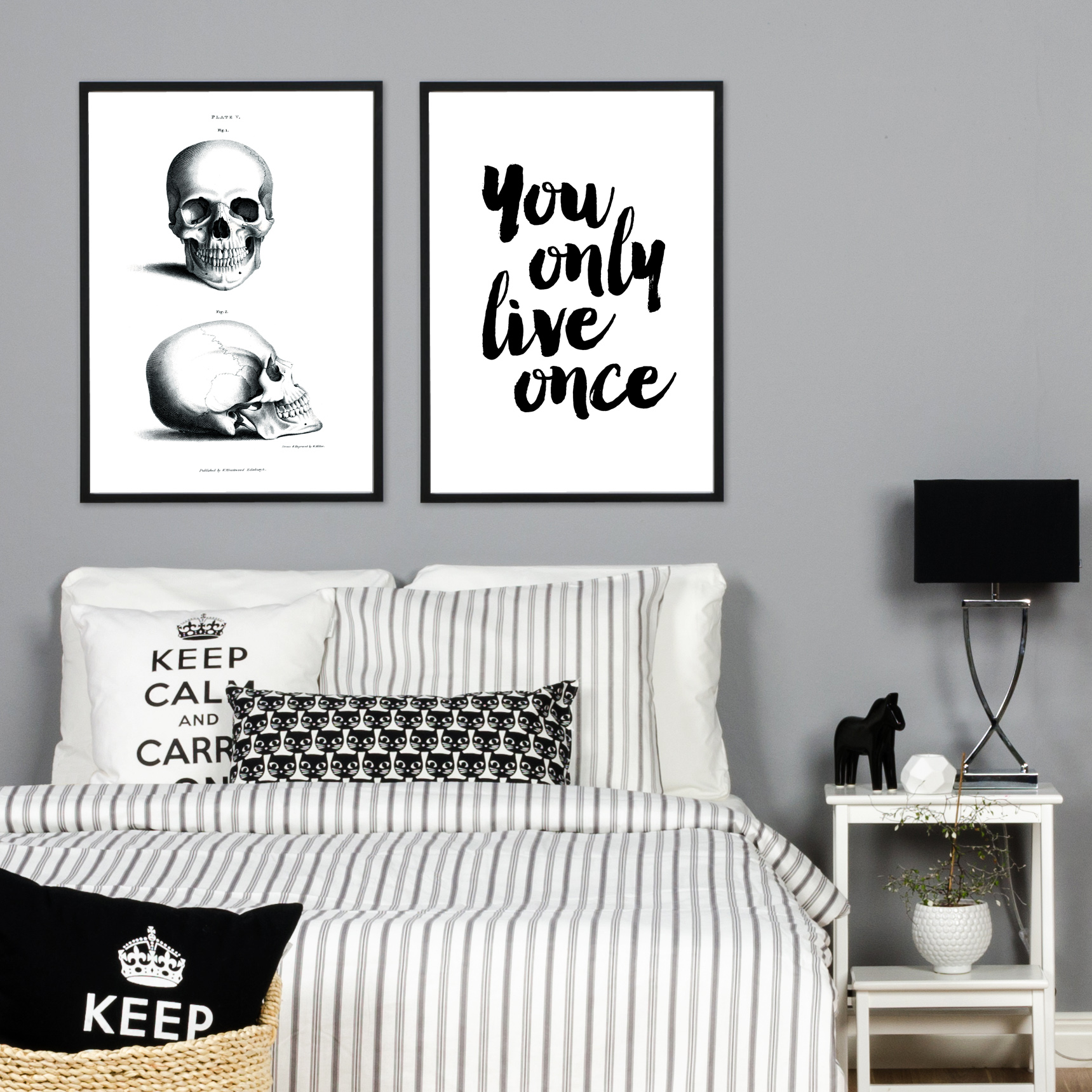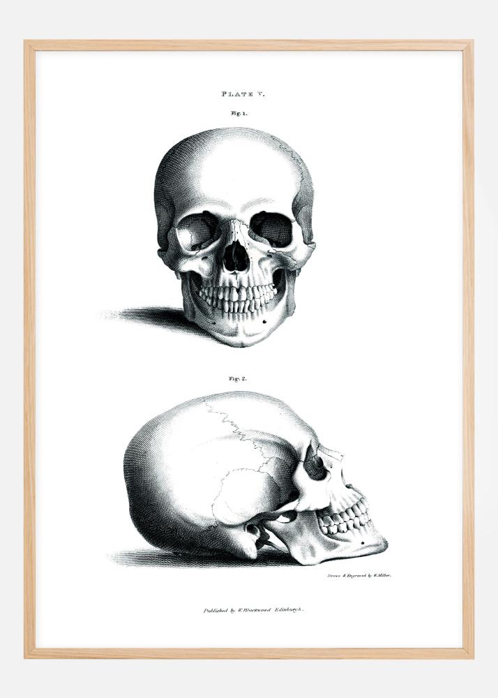 Nebojte sa používať plagáty s trochu makabróznymi motívmi pri zariaďovaní - všetko závisí na tom, s čím ich skombinujete! Tento pekný plagát pochádza zo starej učebnice vydanej v 19. storočí. Ilustrátor sa volal William Miller a bol úspešný rytec. Motív zobrazuje ľudskú lebku spredu a zboku, s veľmi dobre zvládnutými detailmi. Pod motívom nájdete meno rytca a informácie o vydavateľovi. Pretože plagát je čiernobiely, hodí sa rovnako dobre so strieborným rámom, ako aj s farebnejším. K dispozícii je v niekoľkých rôznych veľkostiach, takže si ľahko nájdete taký, ktorý dokonale sadne do vášho domova.