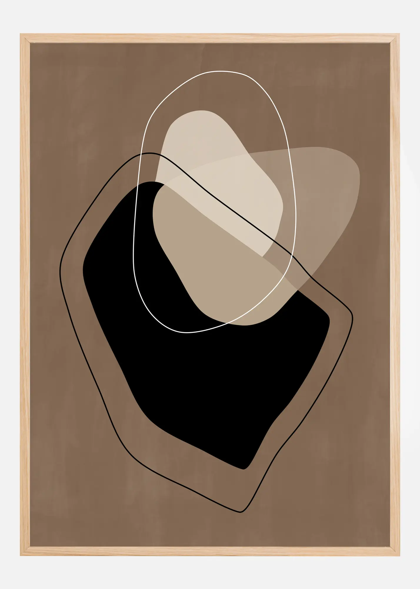 Tento plagát spája estetickú jasnosť geometrickej abstrakcie s teplou a príjemnou farebnou paletou. Predstavuje kreatívnu symbiózu tmavých a svetlých odtieňov, kde výrazné čierne tvary kontrastujú s jemnými bielymi líniami a béžovými a taupefarebnými plochami. Táto konštelácia prvkov je obklopená tenkým, bielym obvodom, ktorý vytvára ilúziu priestoru a hĺbky. Tento plagát je ideálny pre tých, ktorí oceňujú moderný dizajn a hľadajú umelecké dielo, ktoré spája kontrastné farby a tvary spôsobom, ktorý je zároveň podnetný a esteticky príťažlivý.