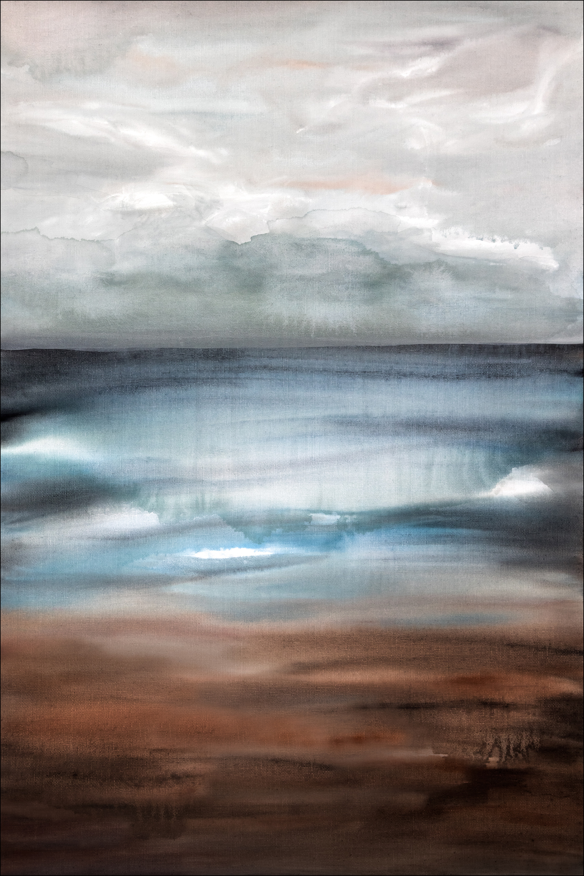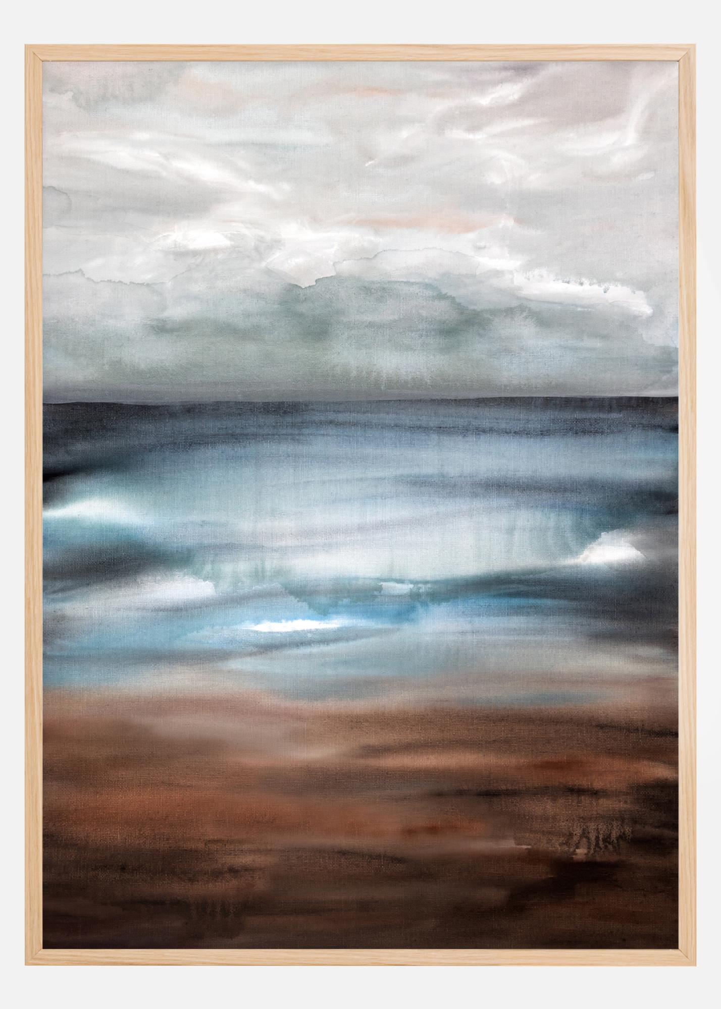 Uvoľňujúce zobrazenie nového dňa. Jemné pastelové farby ukazujú zamračené ráno s hmlou nad morom. Horizont sa dokonale spája so sivými a bielymi mrakmi. S touto uvoľňujúcou a upokojujúcou plagátom na stene môžete takmer počuť more.