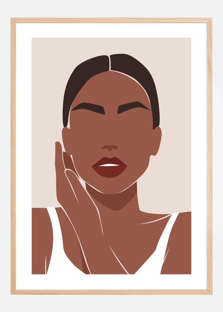 Tento esteticky príťažlivý plagát zobrazuje ženskú siluetu v štýlizovanej a zjednodušenej forme. Obraz je vytvorený s obmedzeným farebným spektrom, ktorý pozostáva z prírodných tónov, od svetlej béžovej až po tmavšiu hnedú, čo vytvára teplý a prívetivý pocit. Postavenie ženy je uvoľnené a zamyslené, čo dodáva portrétu pocit pokoja a sebavedomia.