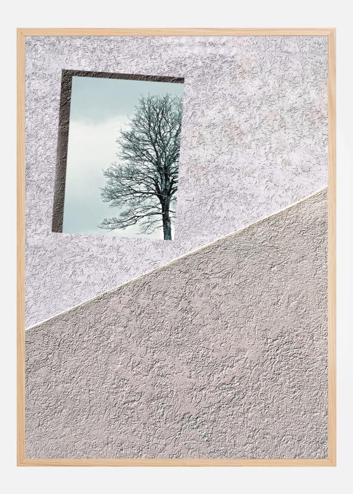 Krásny plagát na ružovej a hnedej stene. Hrubo omietnutá stena je rozdelená na dve časti. Na ružovej strane steny môžete vidieť mierne zamračenú modrú oblohu s stromom v popredí, zatiaľ čo hnedá stena je prázdna. Kreatívny obraz pre každý moderný domov.