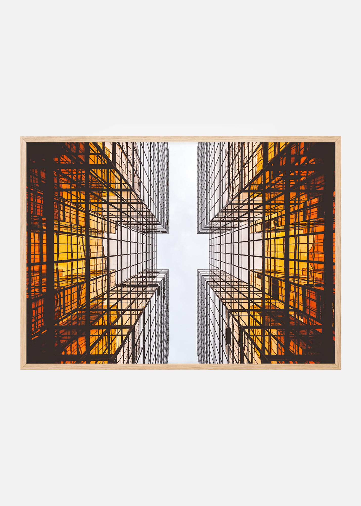 Plagát s futuristickou architektúrou, ktorá vytvára vzrušujúci vzor so svojimi grafickými líniami. Farby prechádzajú z hlboko oranžovej na spodku budovy smerom k bielemu nebu. Plagát sa dobre hodí s tenším rámom v minimalistickom interiéri, ako aj v iných štýloch s grafickými prvkami. Skombinujte ho s inými obrazmi vzrušujúcej architektúry alebo mestského prostredia.