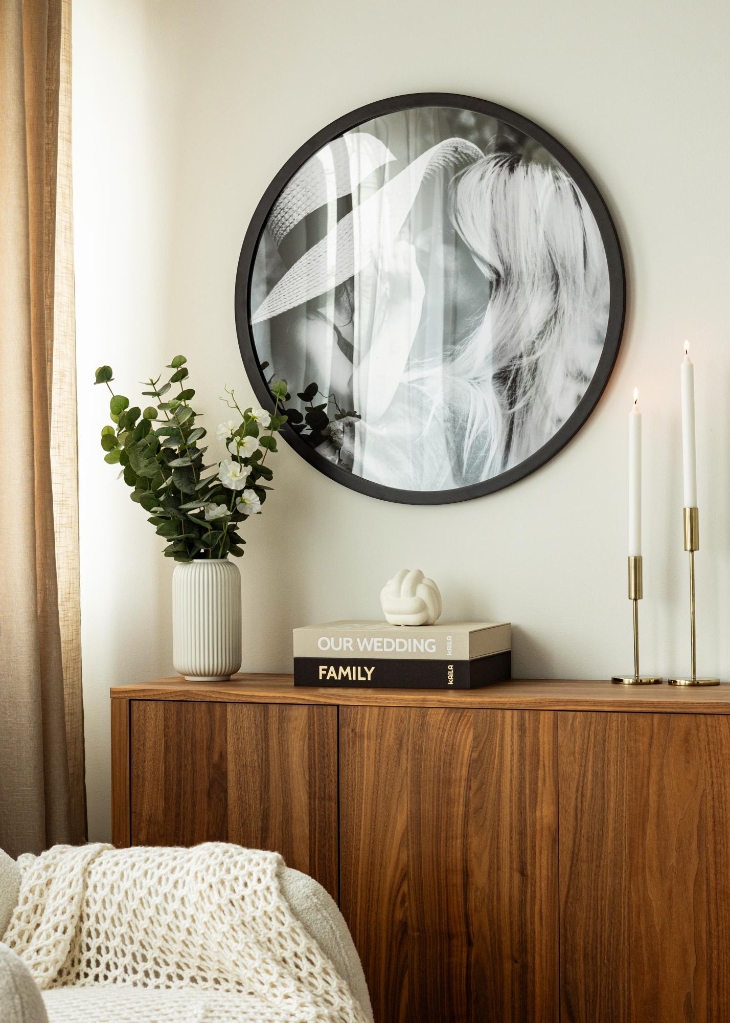 Dajte svojim stenám moderný nádych s touto elegantnou okrúhlou čiernou fotorámom. S priemerom 70 cm Ø sa stane pútavým prvkom v každej miestnosti. Štíhla rámová lišta so šírkou 25 mm dopĺňa motív bez dominovania, zatiaľ čo hĺbka rámu 18 mm poskytuje výrazný profil.