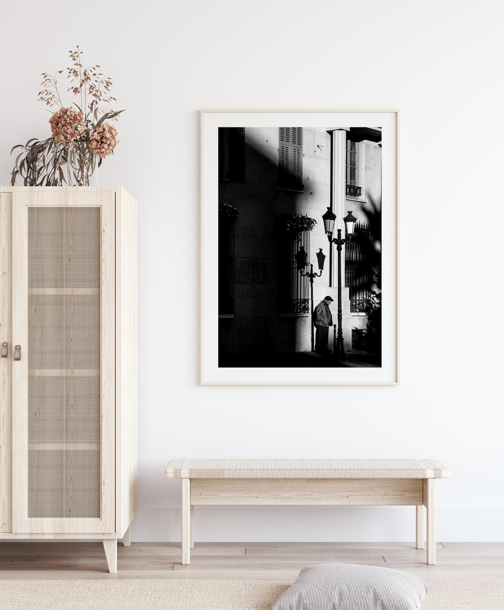 Čiernobiela fotografia starnúceho muža, ktorý s pátravým pohľadom stojí a pozoruje niečo, obklopený živou hrou tieňov mesta. Pokojný a pekný plagát, ktorý sa dobre vyníma sám o sebe alebo v kombinácii s ďalšími obľúbenými na väčšej stene s obrazmi.
