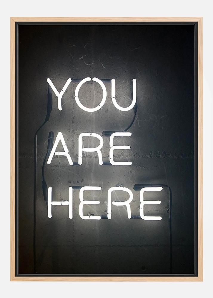 Čierno-biely textový plagát neónovej tabule s informatívnym textom "You are here". Jednoduchý a štýlový obraz s príjemným humoristickým prvkom, ideálny na kombinovanie s ostatnými našimi fantastickými motívmi na väčšiu stenu s obrazmi.
