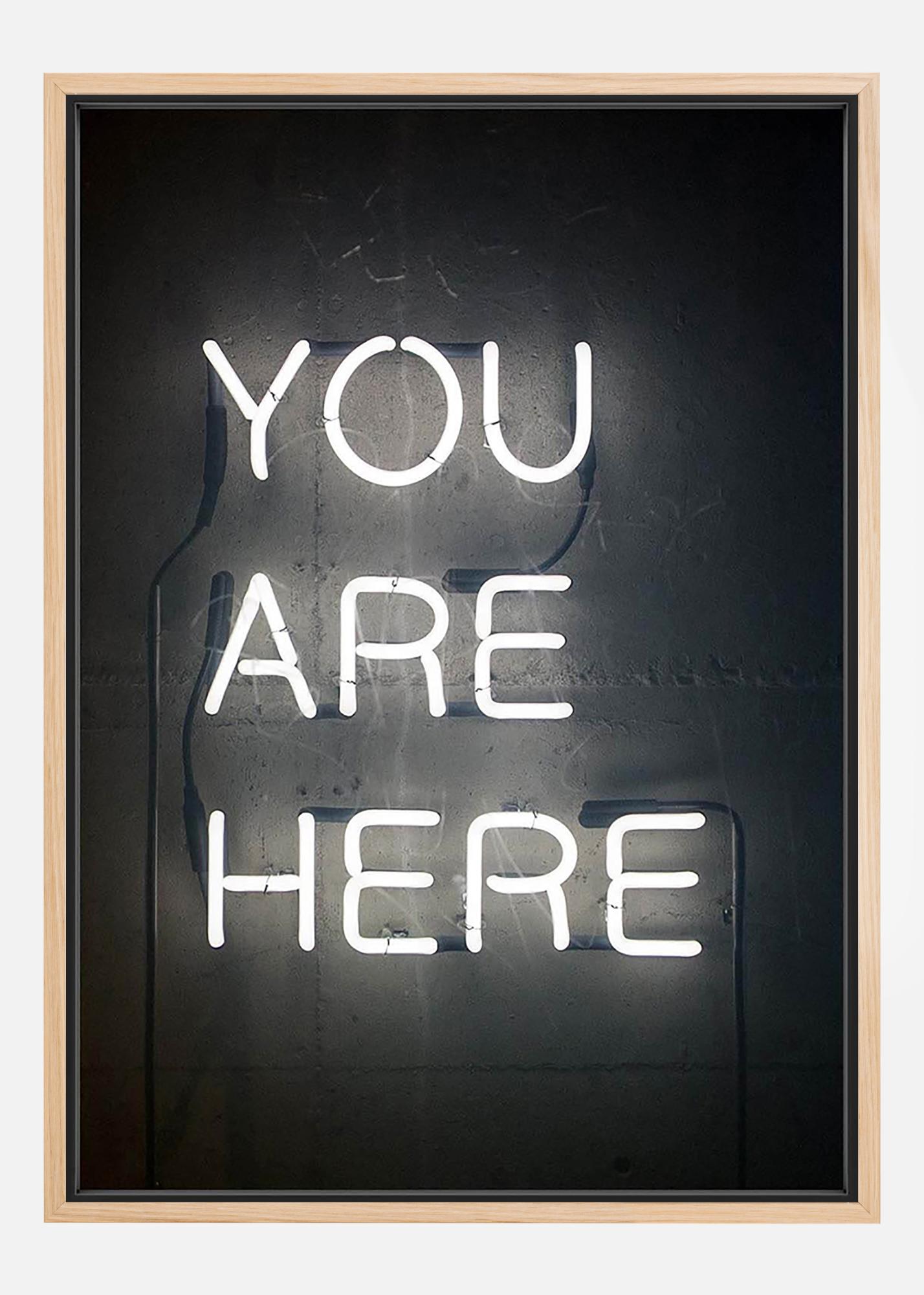 Čierno-biely textový plagát neónového nápisu s informačným textom "You are here". Jednoduchý a štýlový obraz s príjemným humoristickým prvkom, ideálny na kombináciu s ďalšími našimi fantastickými motívmi na väčšej stene s obrazmi.