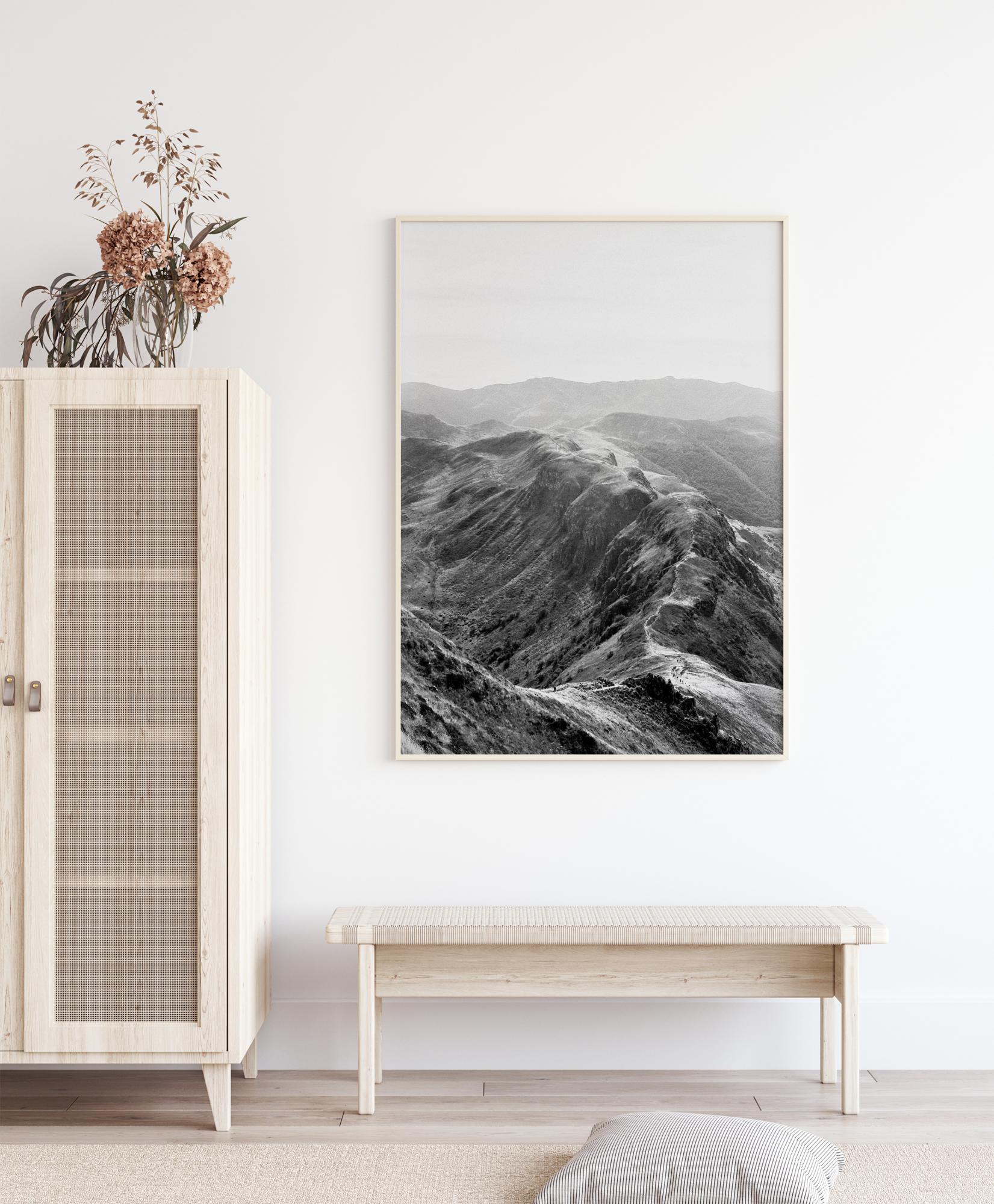 Čiernobiely plagát s pohorím. Rôzne odtiene šedej sa všetky dokonale prelínajú. Bez známok vegetácie alebo života je takmer možné počuť ticho na vrcholoch hôr. Zaveste si túto tlač na farebnú stenu a počúvajte vietor, ktorý fúka.